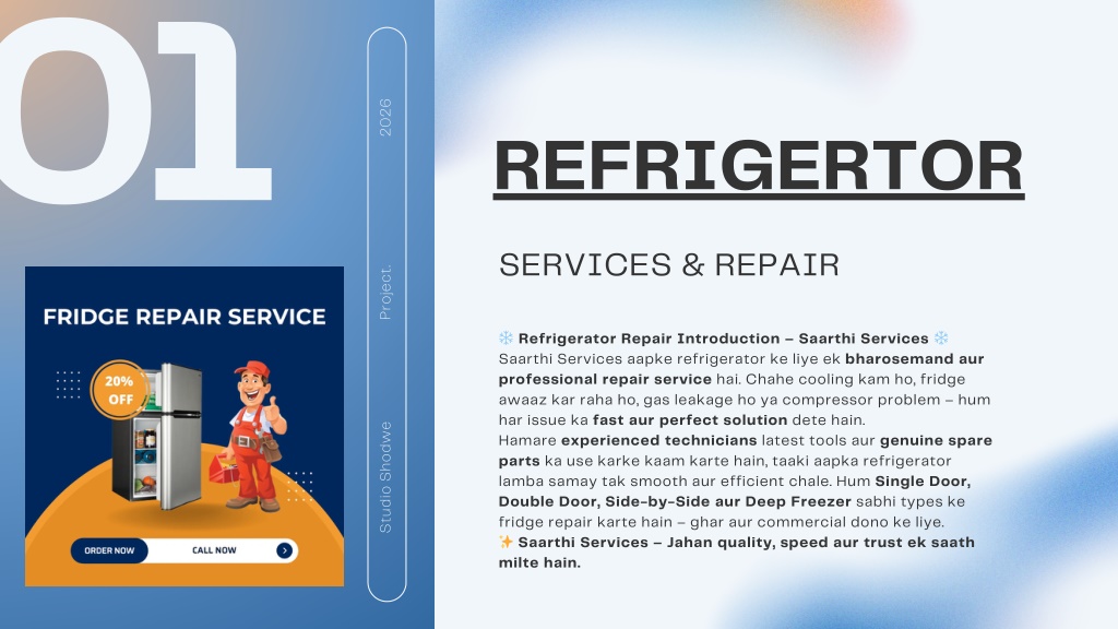 2. 01 2026 REFRIGERTOR SERVICES & REPAIR Project. ❄ Refrigerator Repair Introduction – Saarthi Services ❄ Saarthi Services aapke refrigerator ke liye ek bharosemand aur professional repair service hai. Chahe cooling kam ho, fridge awaaz kar raha ho, gas leakage ho ya compressor problem – hum har issue ka fast aur perfect solution dete hain. Hamare experienced technicians latest tools aur genuine spare parts ka use karke kaam karte hain, taaki aapka refrigerator lamba samay tak smooth aur efficient chale. Hum Single Door, Double Door, Side-by-Side aur Deep Freezer sabhi types ke fridge repair karte hain – ghar aur commercial dono ke liye. ✨Saarthi Services – Jahan quality, speed aur trust ek saath milte hain. Studio Shodwe