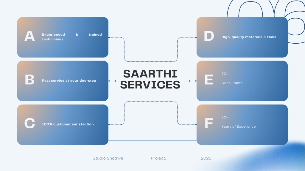 7. 06 A D Experienced technicians & trained High-quality materials & tools SAARTHI SERVICES 20+ B E Fast service at your doorstep Consultants 20+ C F 100% customer satisfaction Years of Excellence Studio Shodwe Project. 2026