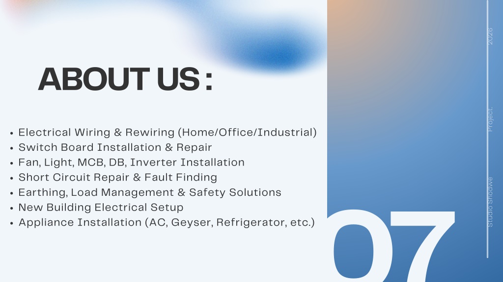8. 2026 ABOUT US : Project. Electrical Wiring & Rewiring (Home/Office/Industrial) Switch Board Installation & Repair Fan, Light, MCB, DB, Inverter Installation Short Circuit Repair & Fault Finding Earthing, Load Management & Safety Solutions New Building Electrical Setup Appliance Installation (AC, Geyser, Refrigerator, etc.) Studio Shodwe 07