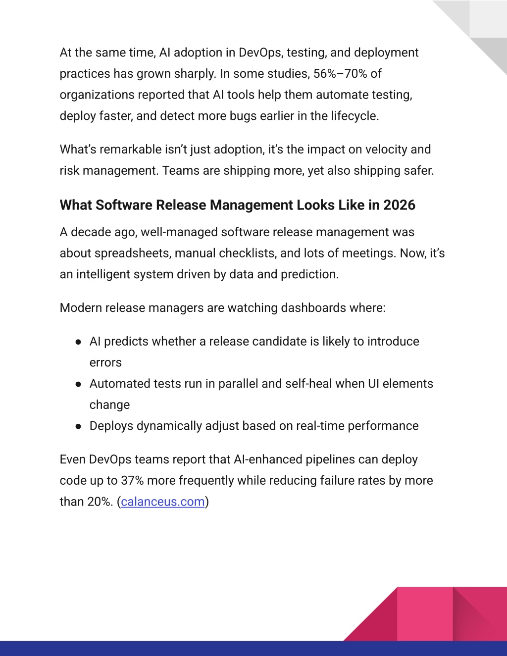 At the same time, AI adoption in DevOps, testing, and deployment practices has grown sharply. In some studies, 56%–70% of organizations reported that AI tools help them automate testing, deploy faster, and detect more bugs earlier in the lifecycle. What’s remarkable isn’t just adoption, it’s the impact on velocity and risk management. Teams are shipping more, yet also shipping safer. What Software Release Management Looks Like in 2026 A decade ago, well-managed software release management was about spreadsheets, manual checklists, and lots of meetings. Now, it’s an intelligent system driven by data and prediction. Modern release managers are watching dashboards where: ● AI predicts whether a release candidate is likely to introduce errors ● Automated tests run in parallel and self-heal when UI elements change ● Deploys dynamically adjust based on real-time performance Even DevOps teams report that AI-enhanced pipelines can deploy code up to 37% more frequently while reducing failure rates by more than 20%. (calanceus.com)