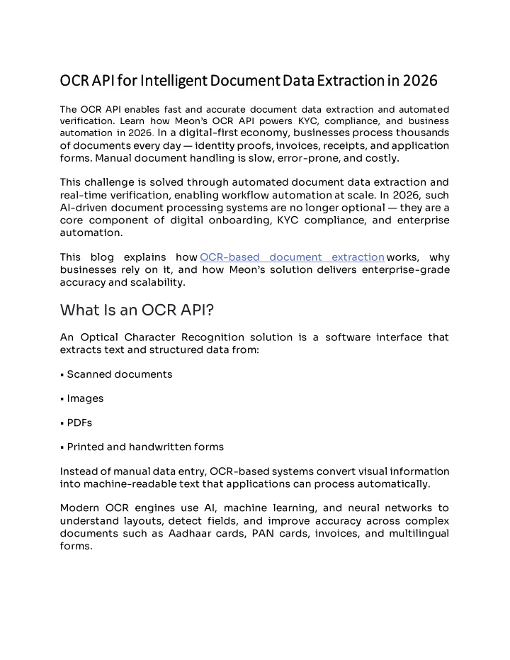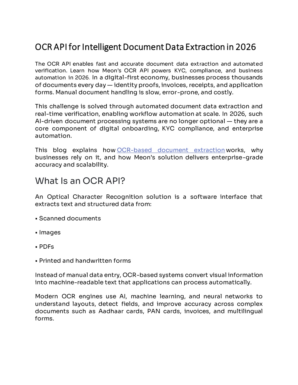 OCR API for Intelligent Document Data Extraction in 2026 OCR API for Intelligent Document Data Extraction in 2026 The OCR API enables fast and accurate document data extraction and automated verification. Learn how Meon’s OCR API powers KYC, compliance, and business automation in 2026. In a digital-first economy, businesses process thousands of documents every day — identity proofs, invoices, receipts, and application forms. Manual document handling is slow, error-prone, and costly. This challenge is solved through automated document data extraction and real-time verification, enabling workflow automation at scale. In 2026, such AI-driven document processing systems are no longer optional — they are a core component of digital onboarding, KYC compliance, and enterprise automation. This blog explains how OCR-based document extraction works, why businesses rely on it, and how Meon’s solution delivers enterprise-grade accuracy and scalability. What Is an OCR API? An Optical Character Recognition solution is a software interface that extracts text and structured data from: • Scanned documents • Images • PDFs • Printed and handwritten forms Instead of manual data entry, OCR-based systems convert visual information into machine-readable text that applications can process automatically. Modern OCR engines use AI, machine learning, and neural networks to understand layouts, detect fields, and improve accuracy across complex documents such as Aadhaar cards, PAN cards, invoices, and multilingual forms.
