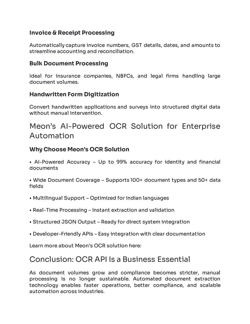 Invoice & Receipt Processing Automatically capture invoice numbers, GST details, dates, and amounts to streamline accounting and reconciliation. Bulk Document Processing Ideal for insurance companies, NBFCs, and legal firms handling large document volumes. Handwritten Form Digitization Convert handwritten applications and surveys into structured digital data without manual intervention. Meon’s AI-Powered OCR Solution for Enterprise Automation Why Choose Meon’s OCR Solution • AI-Powered Accuracy – Up to 99% accuracy for identity and financial documents • Wide Document Coverage – Supports 100+ document types and 50+ data fields • Multilingual Support – Optimized for Indian languages • Real-Time Processing – Instant extraction and validation • Structured JSON Output – Ready for direct system integration • Developer-Friendly APIs – Easy integration with clear documentation Learn more about Meon’s OCR solution here: Conclusion: OCR API Is a Business Essential As document volumes grow and compliance becomes stricter, manual processing is no longer sustainable. Automated document extraction technology enables faster operations, better compliance, and scalable automation across industries.