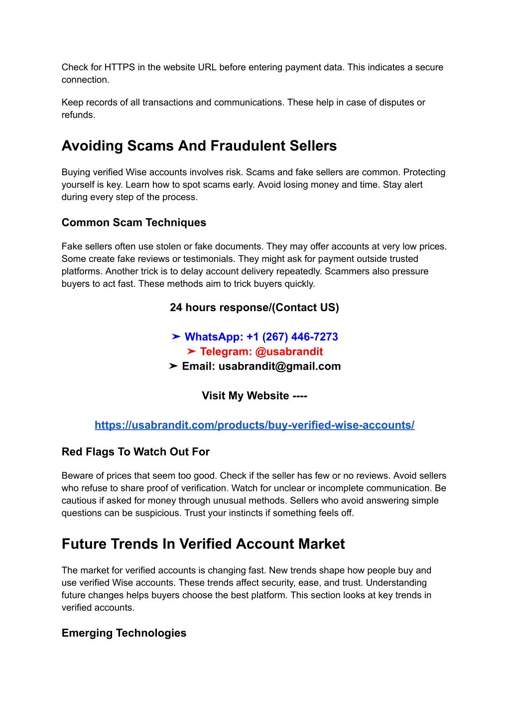 Check for HTTPS in the website URL before entering payment data. This indicates a secure connection. Keep records of all transactions and communications. These help in case of disputes or refunds. Avoiding Scams And Fraudulent Sellers Buying verified Wise accounts involves risk. Scams and fake sellers are common. Protecting yourself is key. Learn how to spot scams early. Avoid losing money and time. Stay alert during every step of the process. Common Scam Techniques Fake sellers often use stolen or fake documents. They may offer accounts at very low prices. Some create fake reviews or testimonials. They might ask for payment outside trusted platforms. Another trick is to delay account delivery repeatedly. Scammers also pressure buyers to act fast. These methods aim to trick buyers quickly. 24 hours response/(Contact US) ➤ WhatsApp: +1 (267) 446-7273 ➤ Telegram: @usabrandit ➤ Email: usabrandit@gmail.com Visit My Website ---- https://usabrandit.com/products/buy-verified-wise-accounts/ Red Flags To Watch Out For Beware of prices that seem too good. Check if the seller has few or no reviews. Avoid sellers who refuse to share proof of verification. Watch for unclear or incomplete communication. Be cautious if asked for money through unusual methods. Sellers who avoid answering simple questions can be suspicious. Trust your instincts if something feels off. Future Trends In Verified Account Market The market for verified accounts is changing fast. New trends shape how people buy and use verified Wise accounts. These trends affect security, ease, and trust. Understanding future changes helps buyers choose the best platform. This section looks at key trends in verified accounts. Emerging Technologies