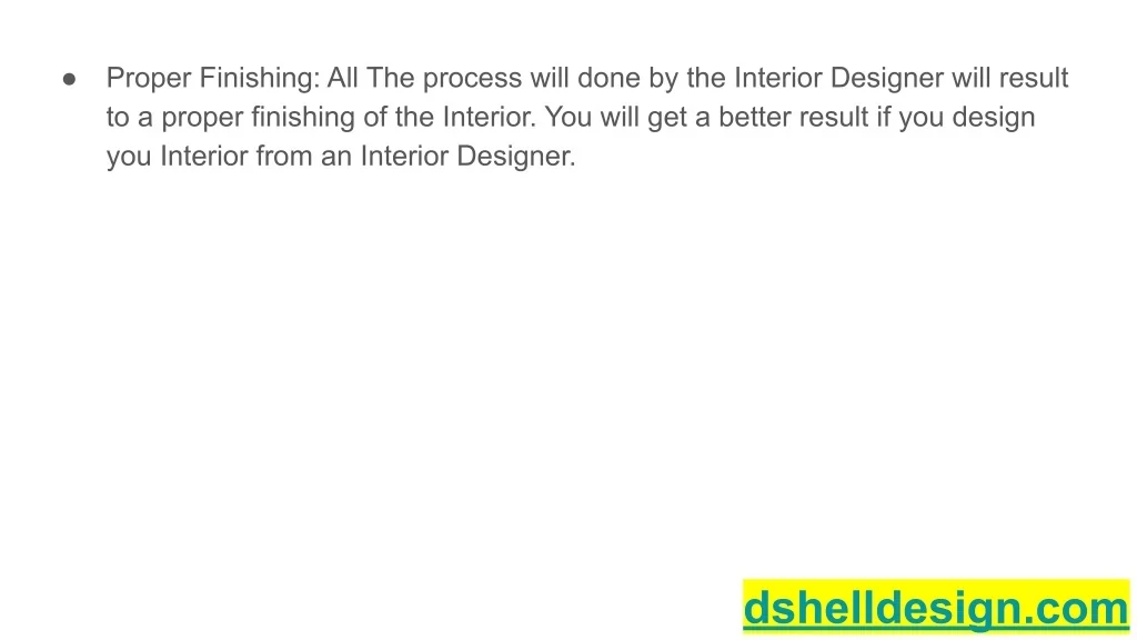 ● Proper Finishing: All The process will done by the Interior Designer will result to a proper finishing of the Interior. You will get a better result if you design you Interior from an Interior Designer. dshelldesign.com
