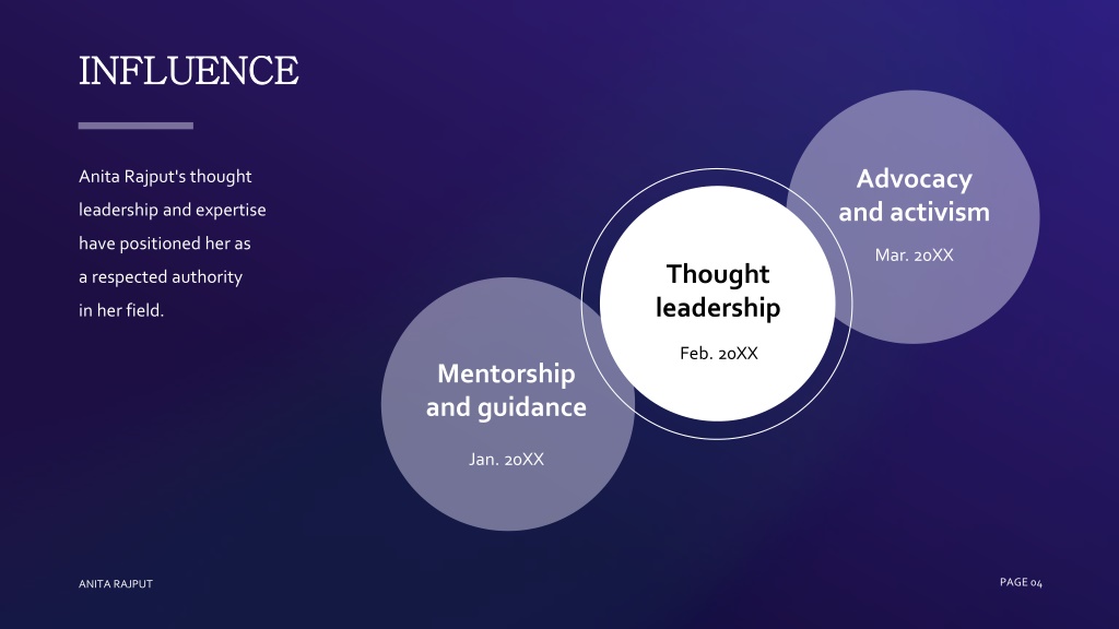 4. Influence Anita Rajput's thought leadership and expertise have positioned her as a respected authority in her field. Mentorshipand guidance Jan. 20XX Thought leadership Feb. 20XX Advocacyand activism Mar. 20XX ANITA RAJPUT