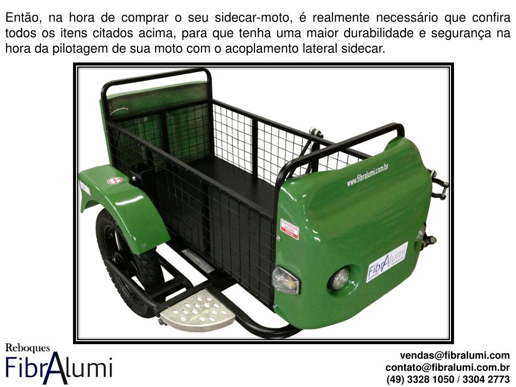 Por isso, o sidecar deve ser escolhido com total segurança, pois é necessário que o cliente que o adquirir, saiba dos componentes que foram utilizados na fabricação sidecar-moto, os documentos necessários, se são todos aqueles pedidos pelos órgãos de inspeção, dados ao comprador, garantia, peças de reposição se necessárias, e o histórico de vendas da fábrica. • vendas@fibralumi.comcontato@fibralumi.com.br • (49) 3328 1050 / 3304 2773