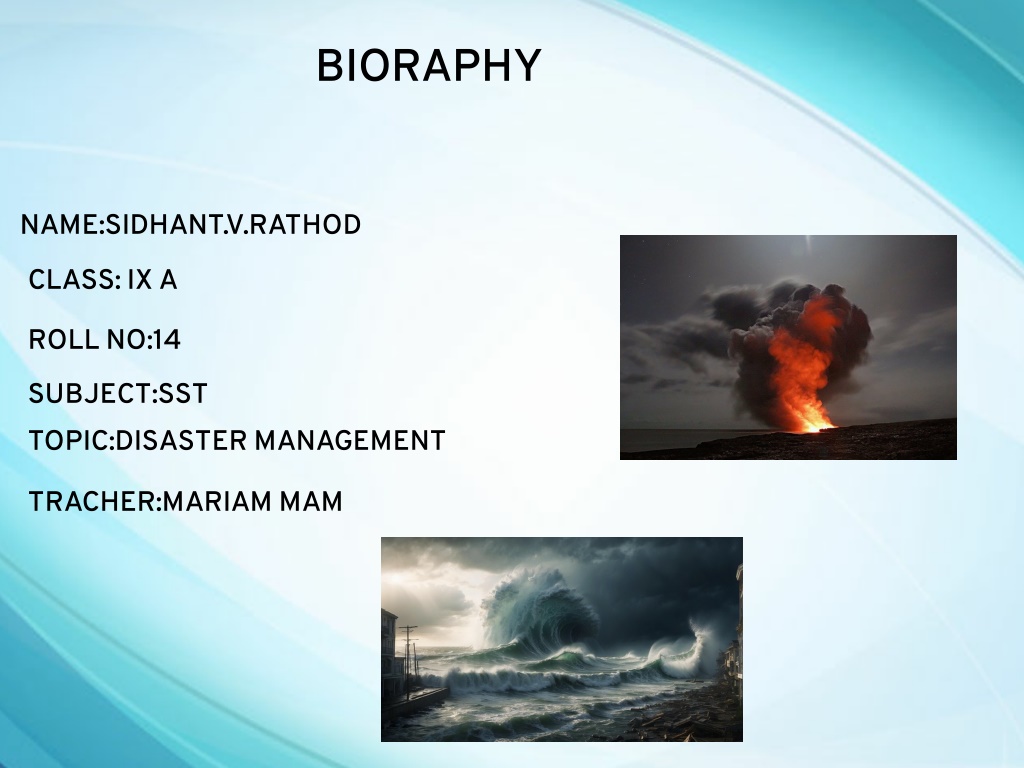 BIORAPHY NAME:SIDHANT.V.RATHOD CLASS: IX A ROLL NO:14 SUBJECT:SST TOPIC:DISASTER MANAGEMENT TRACHER:MARIAM MAM