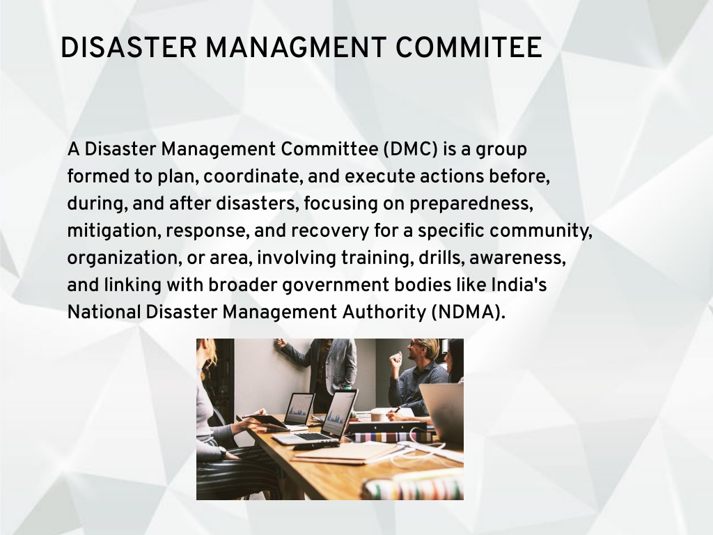 DISASTER MANAGMENT COMMITEE A Disaster Management Committee (DMC) is a group formed to plan, coordinate, and execute actions before, during, and after disasters, focusing on preparedness, mitigation, response, and recovery for a specific community, organization, or area, involving training, drills, awareness, and linking with broader government bodies like India's National Disaster Management Authority (NDMA).