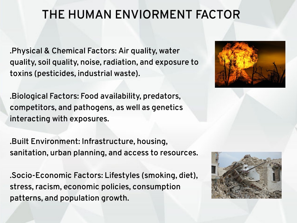 THE HUMAN ENVIORMENT FACTOR .Physical & Chemical Factors: Air quality, water quality, soil quality, noise, radiation, and exposure to toxins (pesticides, industrial waste). .Biological Factors: Food availability, predators, competitors, and pathogens, as well as genetics interacting with exposures. .Built Environment: Infrastructure, housing, sanitation, urban planning, and access to resources. .Socio-Economic Factors: Lifestyles (smoking, diet), stress, racism, economic policies, consumption patterns, and population growth.