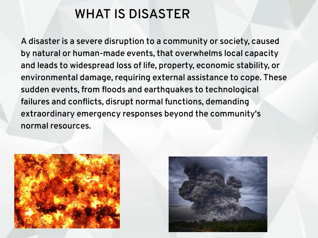 WHAT IS DISASTER A disaster is a severe disruption to a community or society, caused by natural or human-made events, that overwhelms local capacity and leads to widespread loss of life, property, economic stability, or environmental damage, requiring external assistance to cope. These sudden events, from floods and earthquakes to technological failures and conflicts, disrupt normal functions, demanding extraordinary emergency responses beyond the community's normal resources.