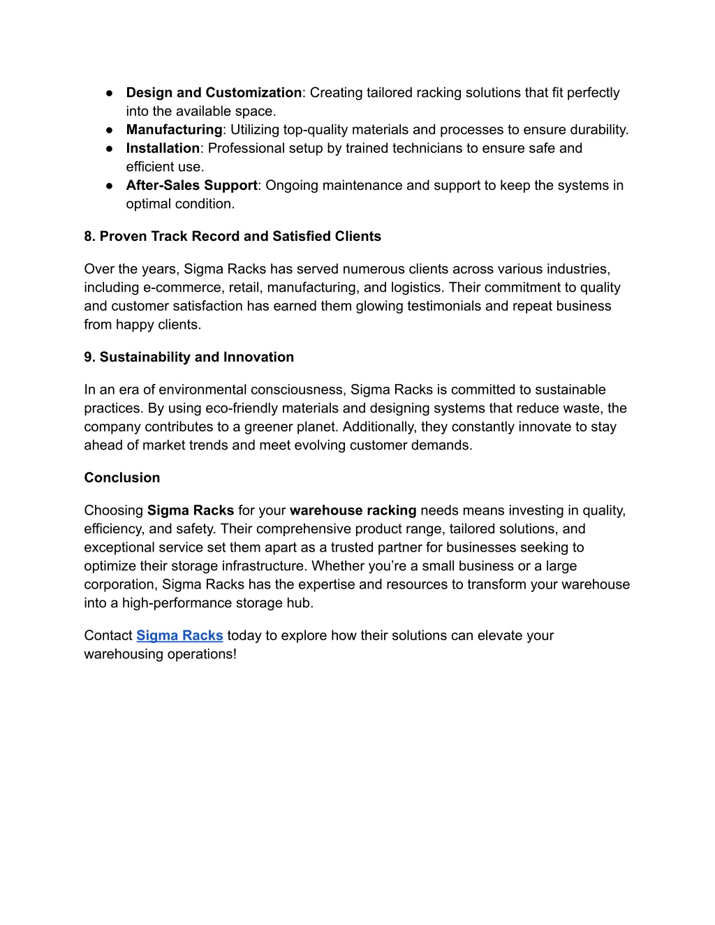● Design and Customization: Creating tailored racking solutions that fit perfectly into the available space. ● Manufacturing: Utilizing top-quality materials and processes to ensure durability. ● Installation: Professional setup by trained technicians to ensure safe and efficient use. ● After-Sales Support: Ongoing maintenance and support to keep the systems in optimal condition. 8. Proven Track Record and Satisfied Clients Over the years, Sigma Racks has served numerous clients across various industries, including e-commerce, retail, manufacturing, and logistics. Their commitment to quality and customer satisfaction has earned them glowing testimonials and repeat business from happy clients. 9. Sustainability and Innovation In an era of environmental consciousness, Sigma Racks is committed to sustainable practices. By using eco-friendly materials and designing systems that reduce waste, the company contributes to a greener planet. Additionally, they constantly innovate to stay ahead of market trends and meet evolving customer demands. Conclusion Choosing Sigma Racks for your warehouse racking needs means investing in quality, efficiency, and safety. Their comprehensive product range, tailored solutions, and exceptional service set them apart as a trusted partner for businesses seeking to optimize their storage infrastructure. Whether you’re a small business or a large corporation, Sigma Racks has the expertise and resources to transform your warehouse into a high-performance storage hub. Contact Sigma Racks today to explore how their solutions can elevate your warehousing operations!