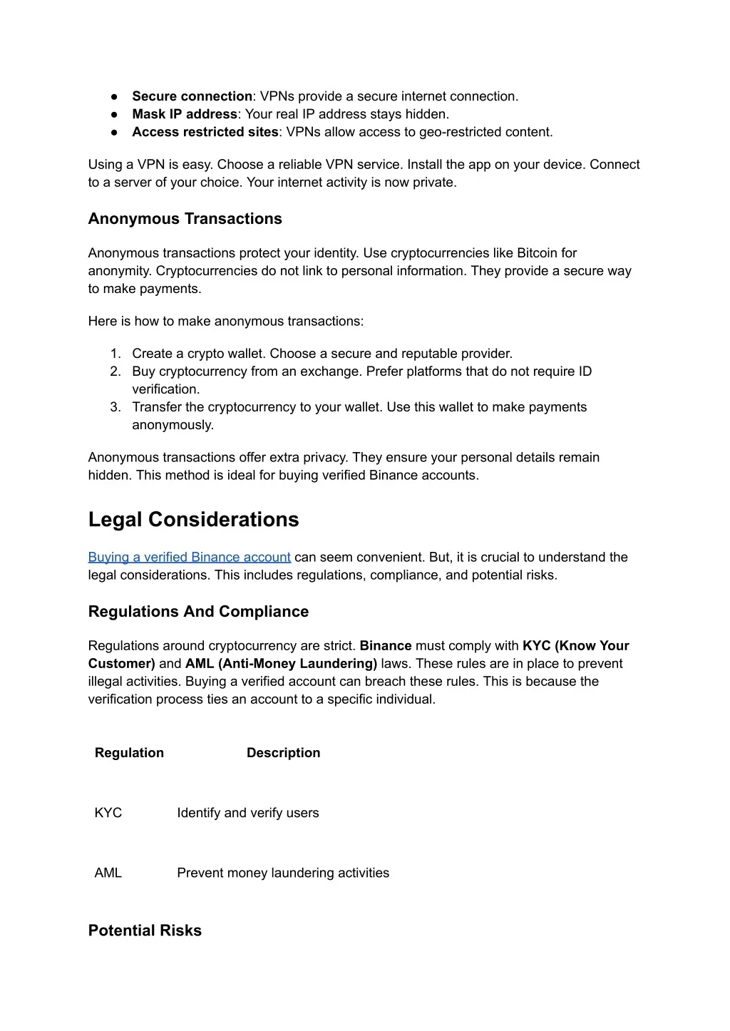 ● ● ● Secure connection: VPNs provide a secure internet connection. Mask IP address: Your real IP address stays hidden. Access restricted sites: VPNs allow access to geo-restricted content. Using a VPN is easy. Choose a reliable VPN service. Install the app on your device. Connect to a server of your choice. Your internet activity is now private. Anonymous Transactions Anonymous transactions protect your identity. Use cryptocurrencies like Bitcoin for anonymity. Cryptocurrencies do not link to personal information. They provide a secure way to make payments. Here is how to make anonymous transactions: 1. Create a crypto wallet. Choose a secure and reputable provider. 2. Buy cryptocurrency from an exchange. Prefer platforms that do not require ID verification. 3. Transfer the cryptocurrency to your wallet. Use this wallet to make payments anonymously. Anonymous transactions offer extra privacy. They ensure your personal details remain hidden. This method is ideal for buying verified Binance accounts. Legal Considerations Buying a verified Binance account can seem convenient. But, it is crucial to understand the legal considerations. This includes regulations, compliance, and potential risks. Regulations And Compliance Regulations around cryptocurrency are strict. Binance must comply with KYC (Know Your Customer) and AML (Anti-Money Laundering) laws. These rules are in place to prevent illegal activities. Buying a verified account can breach these rules. This is because the verification process ties an account to a specific individual. Regulation Description KYC Identify and verify users AML Prevent money laundering activities Potential Risks
