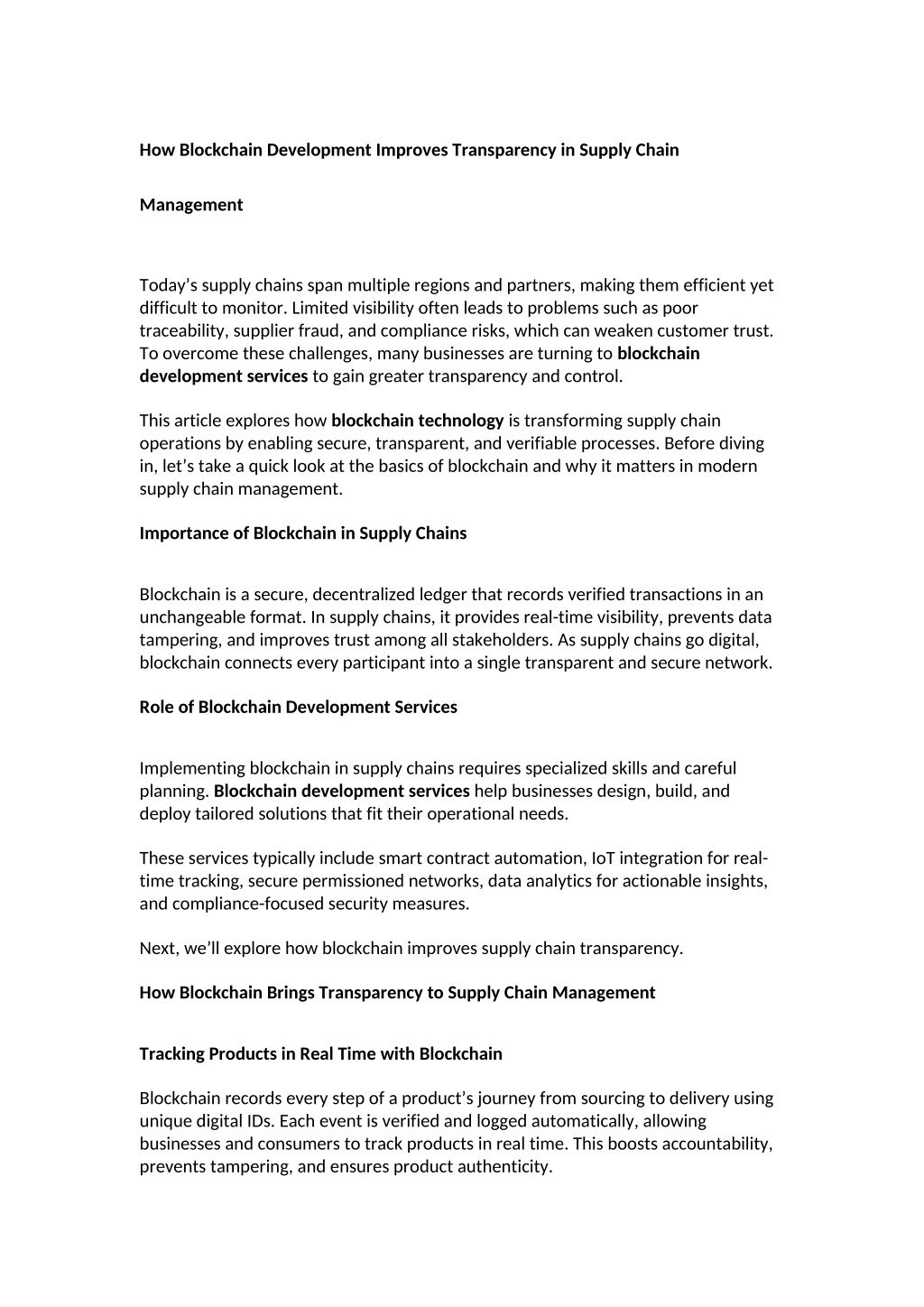 How Blockchain Development Improves Transparency in Supply Chain Management Today’s supply chains span multiple regions and partners, making them efficient yet difficult to monitor. Limited visibility often leads to problems such as poor traceability, supplier fraud, and compliance risks, which can weaken customer trust. To overcome these challenges, many businesses are turning to blockchain development services to gain greater transparency and control. This article explores how blockchain technology is transforming supply chain operations by enabling secure, transparent, and verifiable processes. Before diving in, let’s take a quick look at the basics of blockchain and why it matters in modern supply chain management. Importance of Blockchain in Supply Chains Blockchain is a secure, decentralized ledger that records verified transactions in an unchangeable format. In supply chains, it provides real-time visibility, prevents data tampering, and improves trust among all stakeholders. As supply chains go digital, blockchain connects every participant into a single transparent and secure network. Role of Blockchain Development Services Implementing blockchain in supply chains requires specialized skills and careful planning. Blockchain development services help businesses design, build, and deploy tailored solutions that fit their operational needs. These services typically include smart contract automation, IoT integration for real- time tracking, secure permissioned networks, data analytics for actionable insights, and compliance-focused security measures. Next, we’ll explore how blockchain improves supply chain transparency. How Blockchain Brings Transparency to Supply Chain Management Tracking Products in Real Time with Blockchain Blockchain records every step of a product’s journey from sourcing to delivery using unique digital IDs. Each event is verified and logged automatically, allowing businesses and consumers to track products in real time. This boosts accountability, prevents tampering, and ensures product authenticity.