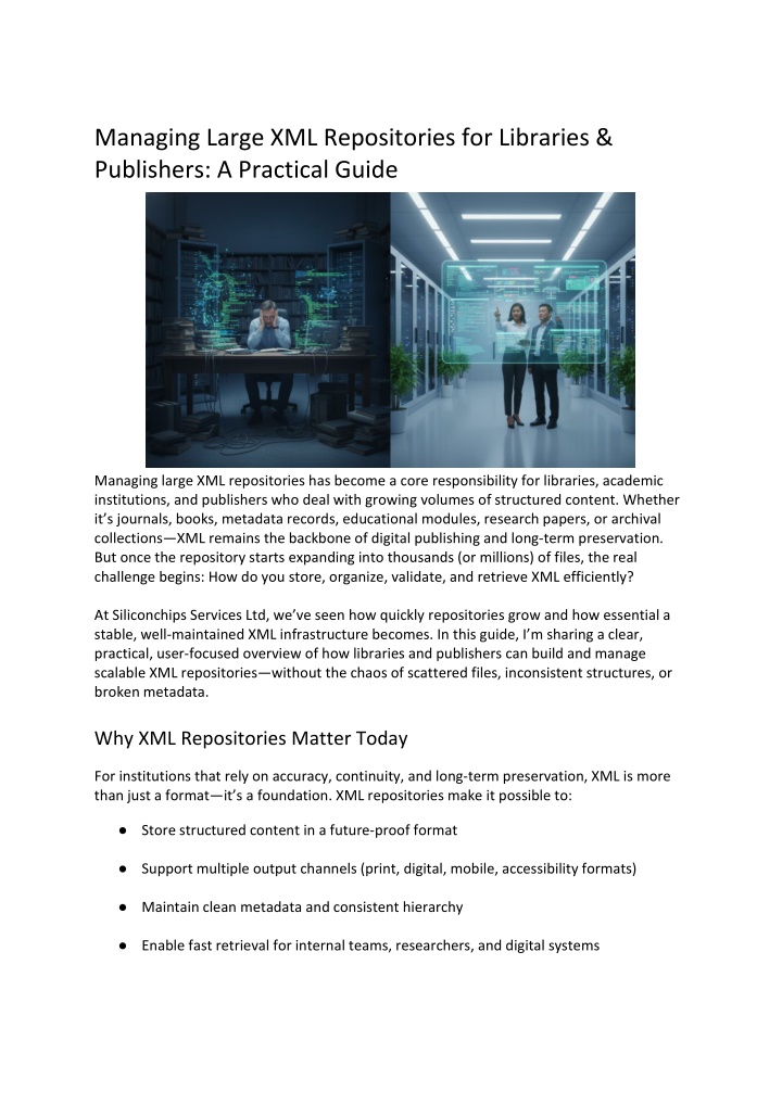 A detailed guide on managing large XML repositories, ensuring clean storage, accurate metadata, and fast retrieval. Improve digital archiving with Siliconchips Services Ltd.<br>