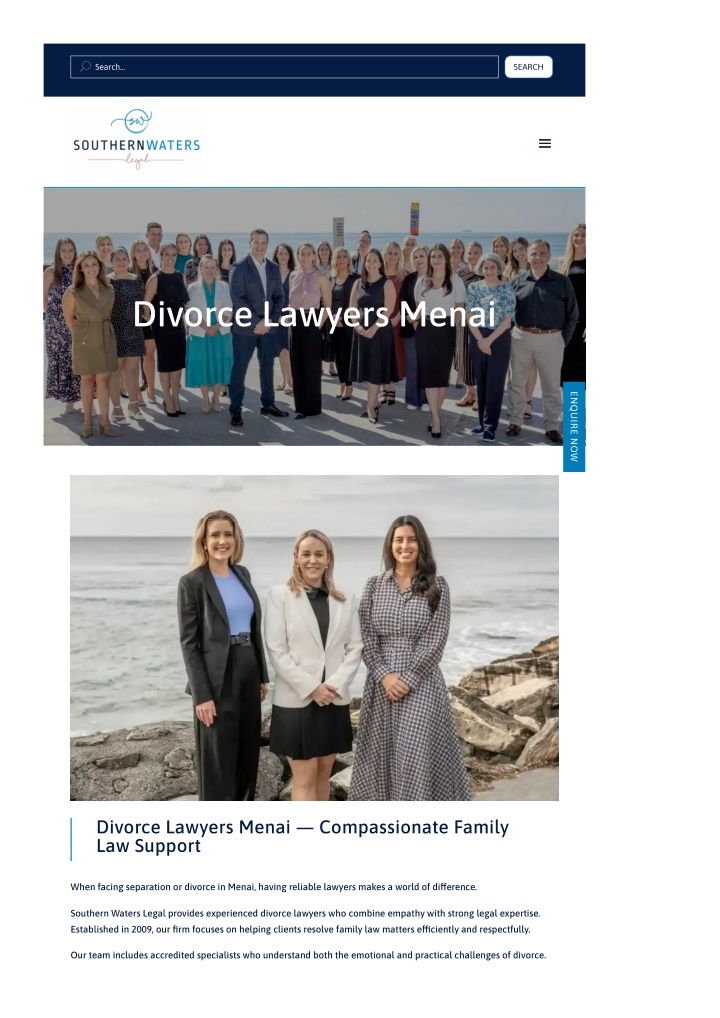 U Search... SEARCH a a Divorce Lawyers Menai ENQUIRE NOW Divorce Lawyers Menai — Compassionate Family Law Support When facing separation or divorce in Menai, having reliable lawyers makes a world of di?erence. Southern Waters Legal provides experienced divorce lawyers who combine empathy with strong legal expertise. Established in 2009, our ?rm focuses on helping clients resolve family law matters e?ciently and respectfully. Our team includes accredited specialists who understand both the emotional and practical challenges of divorce.