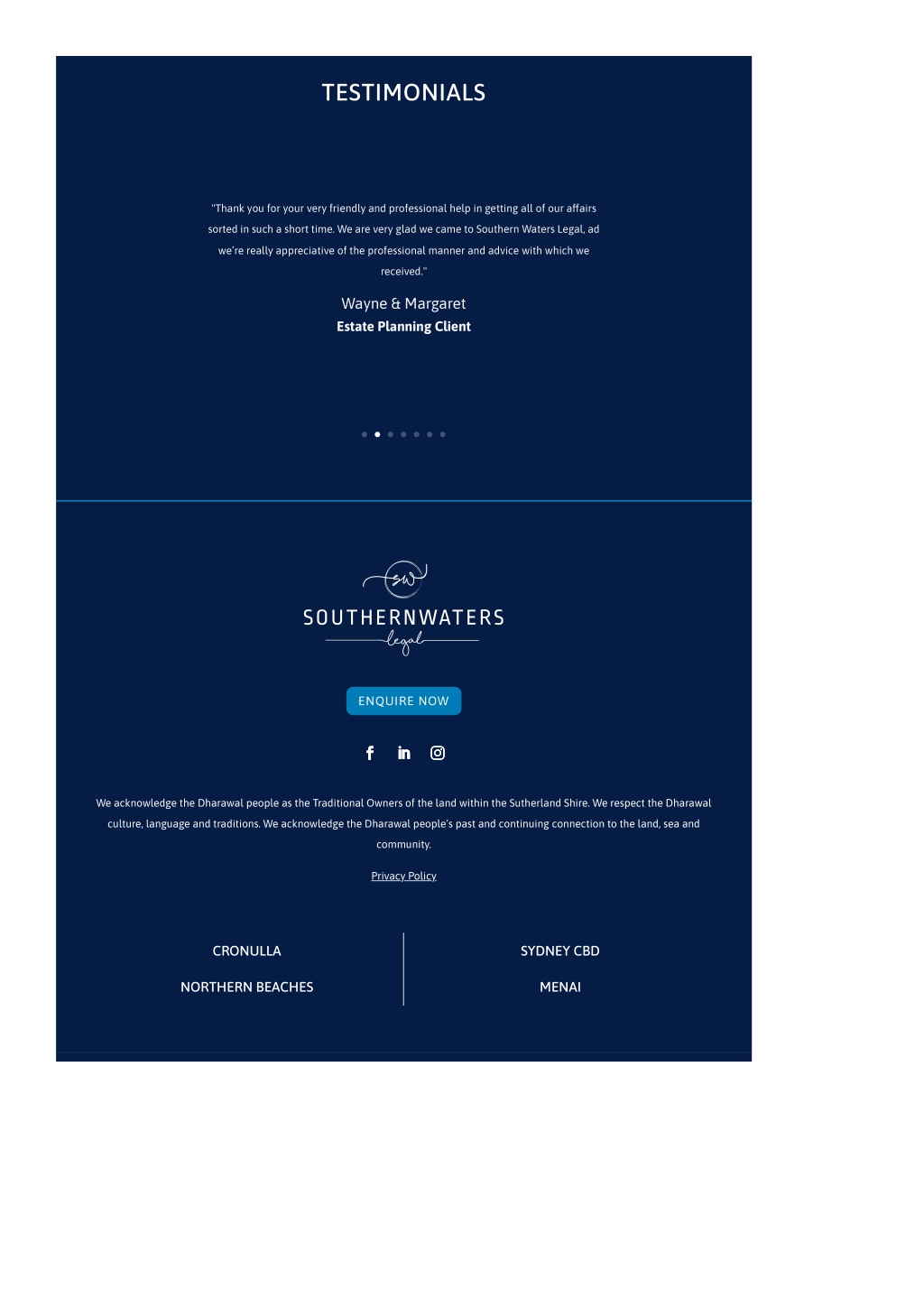TESTIMONIALS "Thank you for your very friendly and professional help in getting all of our a?airs sorted in such a short time. We are very glad we came to Southern Waters Legal, ad we’re really appreciative of the professional manner and advice with which we received." Wayne & Margaret Estate Planning Client ENQUIRE NOW We acknowledge the Dharawal people as the Traditional Owners of the land within the Sutherland Shire. We respect the Dharawal culture, language and traditions. We acknowledge the Dharawal people’s past and continuing connection to the land, sea and community. Privacy Policy CRONULLA SYDNEY CBD NORTHERN BEACHES MENAI