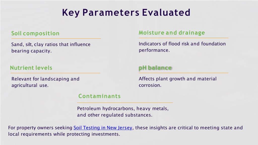 KeyParametersEvaluated Moistureanddrainage Soilcomposition Indicatorsoffloodriskandfoundation performance. Sand,silt,clayratiosthatinfluence bearingcapacity. pHbalance Nutrientlevels Affectsplantgrowthandmaterial corrosion. Relevantforlandscapingand agriculturaluse. Contaminants Petroleumhydrocarbons,heavymetals, andotherregulatedsubstances. ForpropertyownersseekingSoilTestinginNewJersey,theseinsightsarecriticaltomeetingstateand localrequirementswhileprotectinginvestments.