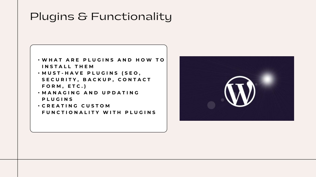 Plugins & Functionality • WHAT ARE PLUGINS AND HOW TO INSTALL THEM • MUST-HAVE PLUGINS (SEO, SECURITY, BACKUP, CONTACT FORM, ETC.) • MANAGING AND UPDATING PLUGINS • CREATING CUSTOM FUNCTIONALITY WITH PLUGINS