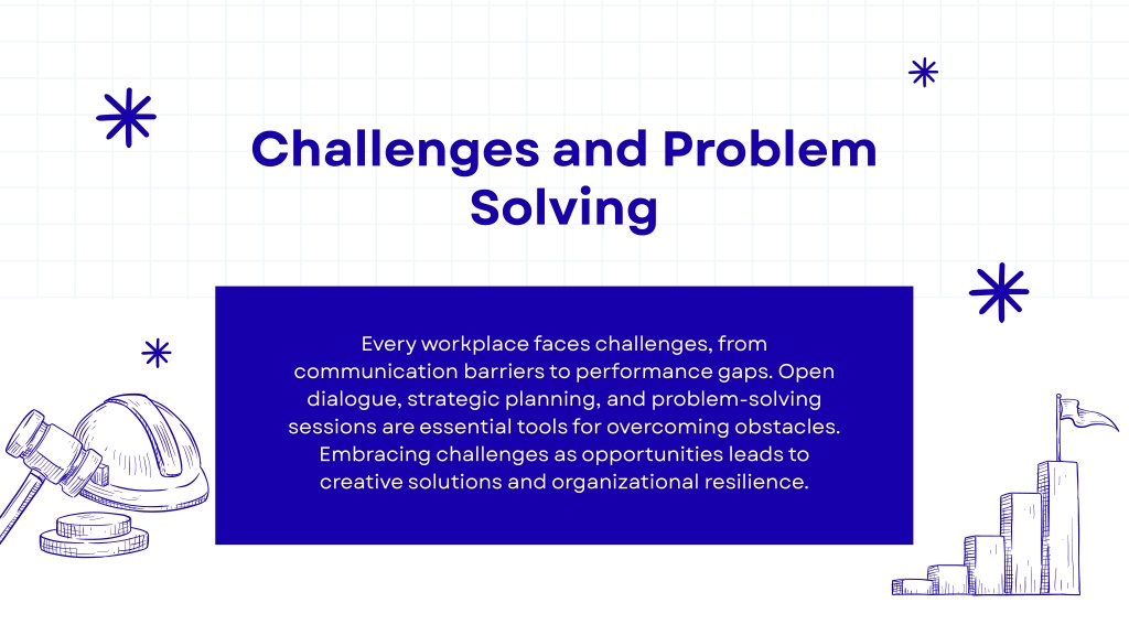 Challenges and Problem Solving Every workplace faces challenges, from communication barriers to performance gaps. Open dialogue, strategic planning, and problem-solving sessions are essential tools for overcoming obstacles. Embracing challenges as opportunities leads to creative solutions and organizational resilience.