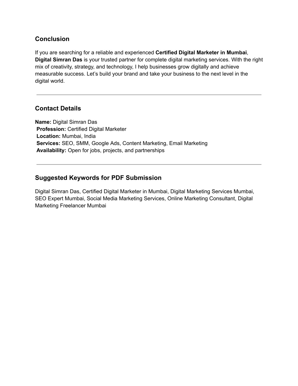 Conclusion If you are searching for a reliable and experienced Certified Digital Marketer in Mumbai, Digital Simran Das is your trusted partner for complete digital marketing services. With the right mix of creativity, strategy, and technology, I help businesses grow digitally and achieve measurable success. Let’s build your brand and take your business to the next level in the digital world. Contact Details Name: Digital Simran Das Profession: Certified Digital Marketer Location: Mumbai, India Services: SEO, SMM, Google Ads, Content Marketing, Email Marketing Availability: Open for jobs, projects, and partnerships Suggested Keywords for PDF Submission Digital Simran Das, Certified Digital Marketer in Mumbai, Digital Marketing Services Mumbai, SEO Expert Mumbai, Social Media Marketing Services, Online Marketing Consultant, Digital Marketing Freelancer Mumbai