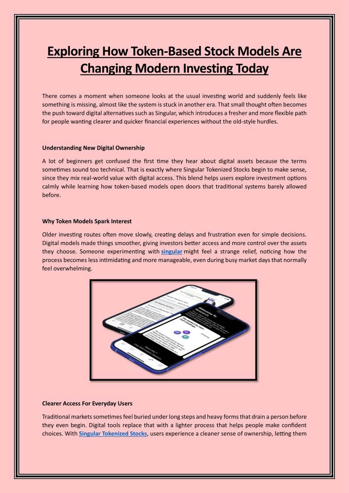 Exploring How Token-Based Stock Models Are Changing Modern Investing Today There comes a moment when someone looks at the usual investing world and suddenly feels like something is missing, almost like the system is stuck in another era. That small thought often becomes the push toward digital alternatives such as Singular, which introduces a fresher and more flexible path for people wanting clearer and quicker financial experiences without the old-style hurdles. Understanding New Digital Ownership A lot of beginners get confused the first time they hear about digital assets because the terms sometimes sound too technical. That is exactly where Singular Tokenized Stocks begin to make sense, since they mix real-world value with digital access. This blend helps users explore investment options calmly while learning how token-based models open doors that traditional systems barely allowed before. Why Token Models Spark Interest Older investing routes often move slowly, creating delays and frustration even for simple decisions. Digital models made things smoother, giving investors better access and more control over the assets they choose. Someone experimenting withsingularmight feel a strange relief, noticing how the process becomes less intimidating and more manageable, even during busy market days that normally feel overwhelming. Clearer Access For Everyday Users Traditional markets sometimes feel buried under long steps and heavy forms that drain a person before they even begin. Digital tools replace that with a lighter process that helps people make confident choices. WithSingular Tokenized Stocks, users experience a cleaner sense of ownership, letting them