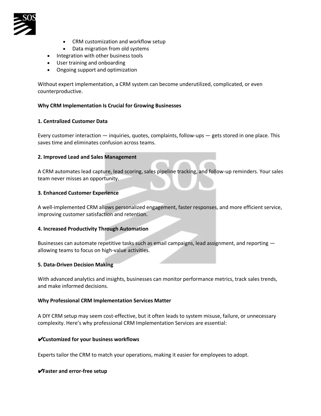 CRM customization and workflow setup Data migration from old systems Integration with other business tools User training and onboarding Ongoing support and optimization Without expert implementation, a CRM system can become underutilized, complicated, or even counterproductive. Why CRM Implementation Is Crucial for Growing Businesses 1. Centralized Customer Data Every customer interaction — inquiries, quotes, complaints, follow-ups — gets stored in one place. This saves time and eliminates confusion across teams. 2. Improved Lead and Sales Management A CRM automates lead capture, lead scoring, sales pipeline tracking, and follow-up reminders. Your sales team never misses an opportunity. 3. Enhanced Customer Experience A well-implemented CRM allows personalized engagement, faster responses, and more efficient service, improving customer satisfaction and retention. 4. Increased Productivity Through Automation Businesses can automate repetitive tasks such as email campaigns, lead assignment, and reporting — allowing teams to focus on high-value activities. 5. Data-Driven Decision Making With advanced analytics and insights, businesses can monitor performance metrics, track sales trends, and make informed decisions. Why Professional CRM Implementation Services Matter A DIY CRM setup may seem cost-effective, but it often leads to system misuse, failure, or unnecessary complexity. Here’s why professional CRM Implementation Services are essential: ✔ ✔ Customized for your business workflows Experts tailor the CRM to match your operations, making it easier for employees to adopt. ✔ ✔ Faster and error-free setup