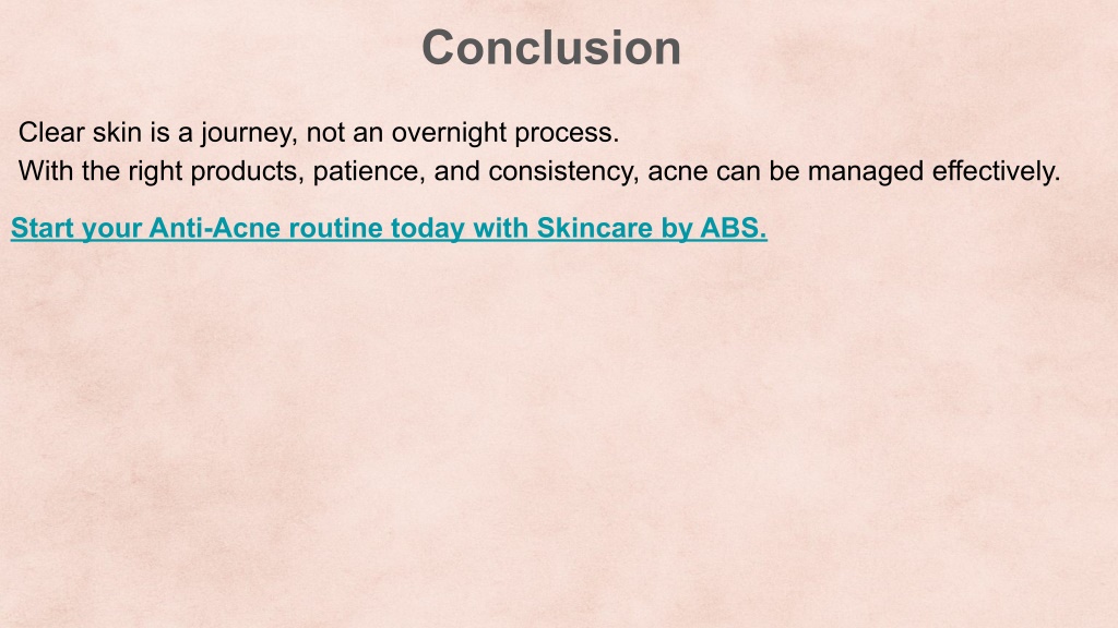 Conclusion Clear skin is a journey, not an overnight process. With the right products, patience, and consistency, acne can be managed effectively. Start your Anti-Acne routine today with Skincare by ABS.