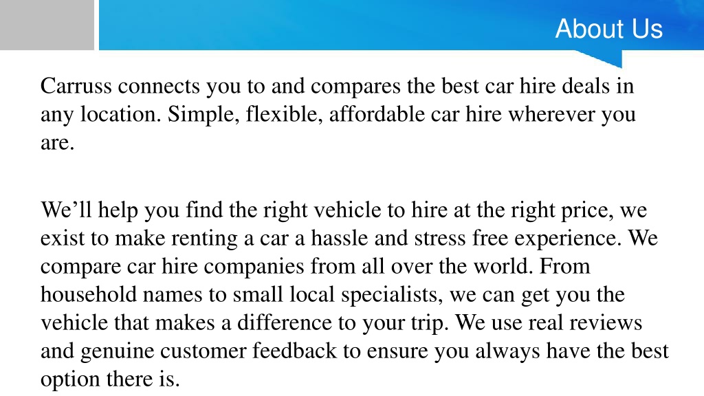 About Us Carruss connects you to and compares the best car hire deals in any location. Simple, flexible, affordable car hire wherever you are. We’ll help you find the right vehicle to hire at the right price, we exist to make renting a car a hassle and stress free experience. We compare car hire companies from all over the world. From household names to small local specialists, we can get you the vehicle that makes a difference to your trip. We use real reviews and genuine customer feedback to ensure you always have the best option there is.