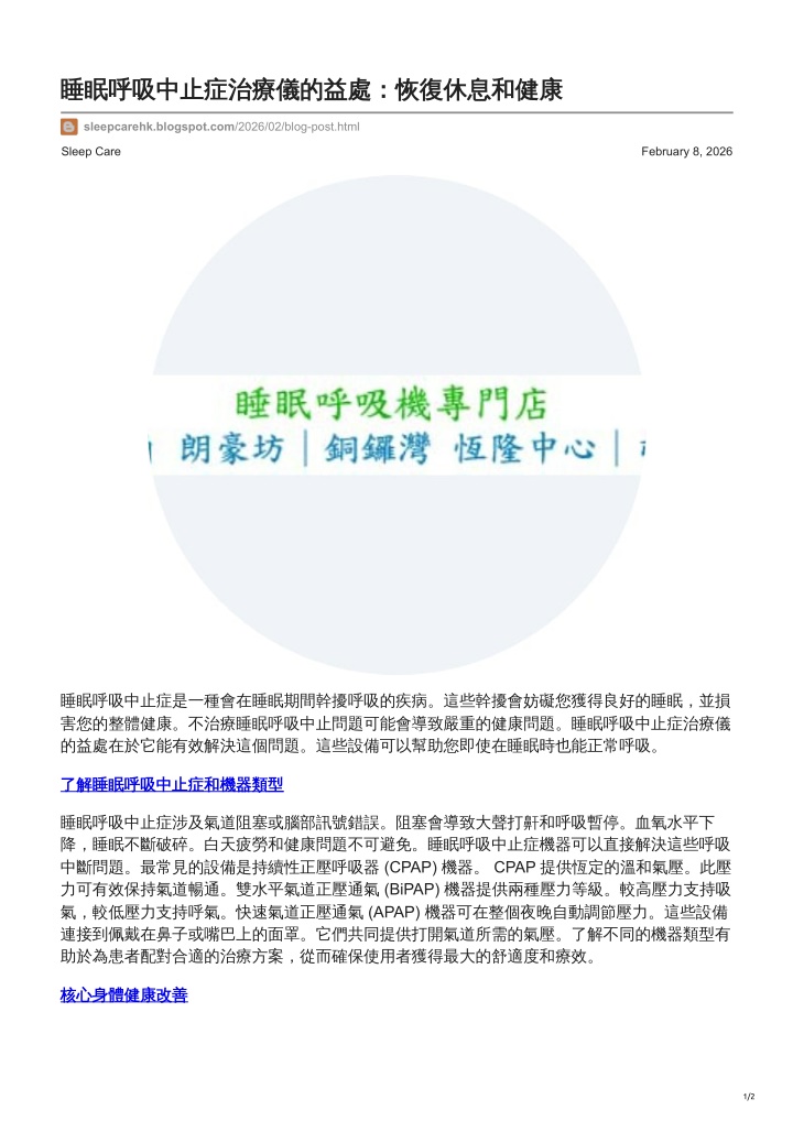 睡眠呼吸中止症治療儀的益處:恢復休息和健康睡眠呼吸中止症治療儀的益處:恢復休息和健康 sleepcarehk.blogspot.com/2026/02/blog-post.html Sleep Care February 8, 2026 睡眠呼吸中止症是一種會在睡眠期間幹擾呼吸的疾病。這些幹擾會妨礙您獲得良好的睡眠,並損 害您的整體健康。不治療睡眠呼吸中止問題可能會導致嚴重的健康問題。睡眠呼吸中止症治療儀 的益處在於它能有效解決這個問題。這些設備可以幫助您即使在睡眠時也能正常呼吸。 了解睡眠呼吸中止症和機器類型 睡眠呼吸中止症涉及氣道阻塞或腦部訊號錯誤。阻塞會導致大聲打鼾和呼吸暫停。血氧水平下 降,睡眠不斷破碎。白天疲勞和健康問題不可避免。睡眠呼吸中止症機器可以直接解決這些呼吸 中斷問題。最常見的設備是持續性正壓呼吸器 (CPAP) 機器。 CPAP 提供恆定的溫和氣壓。此壓 力可有效保持氣道暢通。雙水平氣道正壓通氣 (BiPAP) 機器提供兩種壓力等級。較高壓力支持吸 氣,較低壓力支持呼氣。快速氣道正壓通氣 (APAP) 機器可在整個夜晚自動調節壓力。這些設備 連接到佩戴在鼻子或嘴巴上的面罩。它們共同提供打開氣道所需的氣壓。了解不同的機器類型有 助於為患者配對合適的治療方案,從而確保使用者獲得最大的舒適度和療效。 核心身體健康改善 1/2