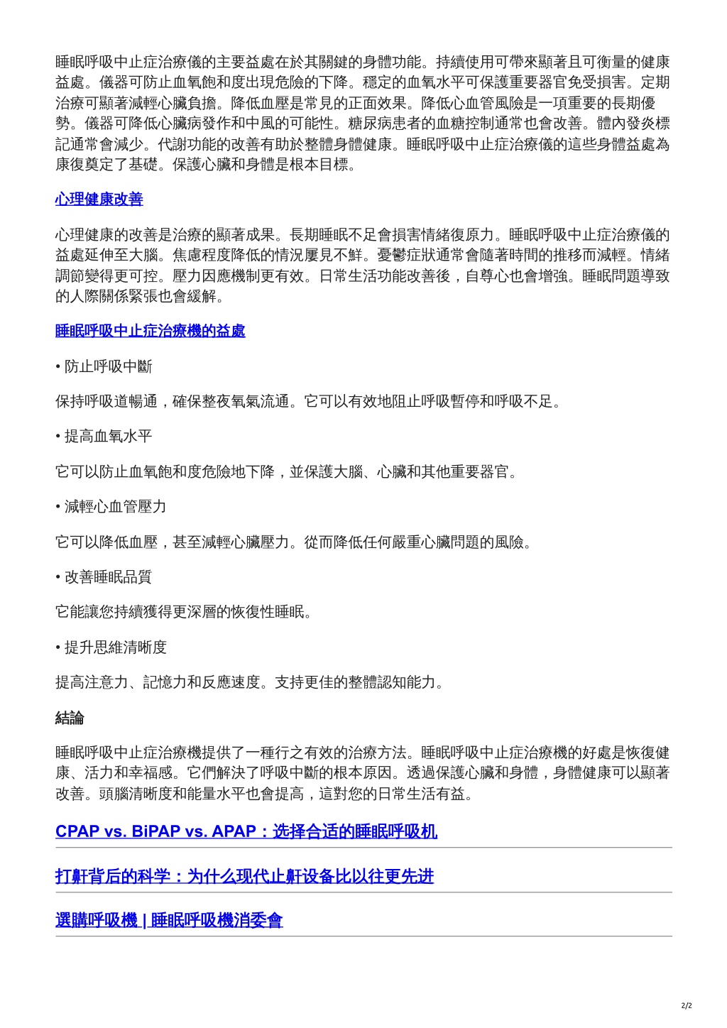 睡眠呼吸中止症治療儀的主要益處在於其關鍵的身體功能。持續使用可帶來顯著且可衡量的健康睡眠呼吸中止症治療儀的主要益處在於其關鍵的身體功能。持續使用可帶來顯著且可衡量的健康 益處。儀器可防止血氧飽和度出現危險的下降。穩定的血氧水平可保護重要器官免受損害。定期 治療可顯著減輕心臟負擔。降低血壓是常見的正面效果。降低心血管風險是一項重要的長期優 勢。儀器可降低心臟病發作和中風的可能性。糖尿病患者的血糖控制通常也會改善。體內發炎標 記通常會減少。代謝功能的改善有助於整體身體健康。睡眠呼吸中止症治療儀的這些身體益處為 康復奠定了基礎。保護心臟和身體是根本目標。 心理健康改善 心理健康的改善是治療的顯著成果。長期睡眠不足會損害情緒復原力。睡眠呼吸中止症治療儀的 益處延伸至大腦。焦慮程度降低的情況屢見不鮮。憂鬱症狀通常會隨著時間的推移而減輕。情緒 調節變得更可控。壓力因應機制更有效。日常生活功能改善後,自尊心也會增強。睡眠問題導致 的人際關係緊張也會緩解。 睡眠呼吸中止症治療機的益處 • 防止呼吸中斷 保持呼吸道暢通,確保整夜氧氣流通。它可以有效地阻止呼吸暫停和呼吸不足。 • 提高血氧水平 它可以防止血氧飽和度危險地下降,並保護大腦、心臟和其他重要器官。 • 減輕心血管壓力 它可以降低血壓,甚至減輕心臟壓力。從而降低任何嚴重心臟問題的風險。 • 改善睡眠品質 它能讓您持續獲得更深層的恢復性睡眠。 • 提升思維清晰度 提高注意力、記憶力和反應速度。支持更佳的整體認知能力。 結論 睡眠呼吸中止症治療機提供了一種行之有效的治療方法。睡眠呼吸中止症治療機的好處是恢復健 康、活力和幸福感。它們解決了呼吸中斷的根本原因。透過保護心臟和身體,身體健康可以顯著 改善。頭腦清晰度和能量水平也會提高,這對您的日常生活有益。 CPAP vs. BiPAP vs. APAP:选择合适的睡眠呼吸机 打鼾背后的科学:为什么现代止鼾设备比以往更先进 選購呼吸機 | 睡眠呼吸機消委會 2/2