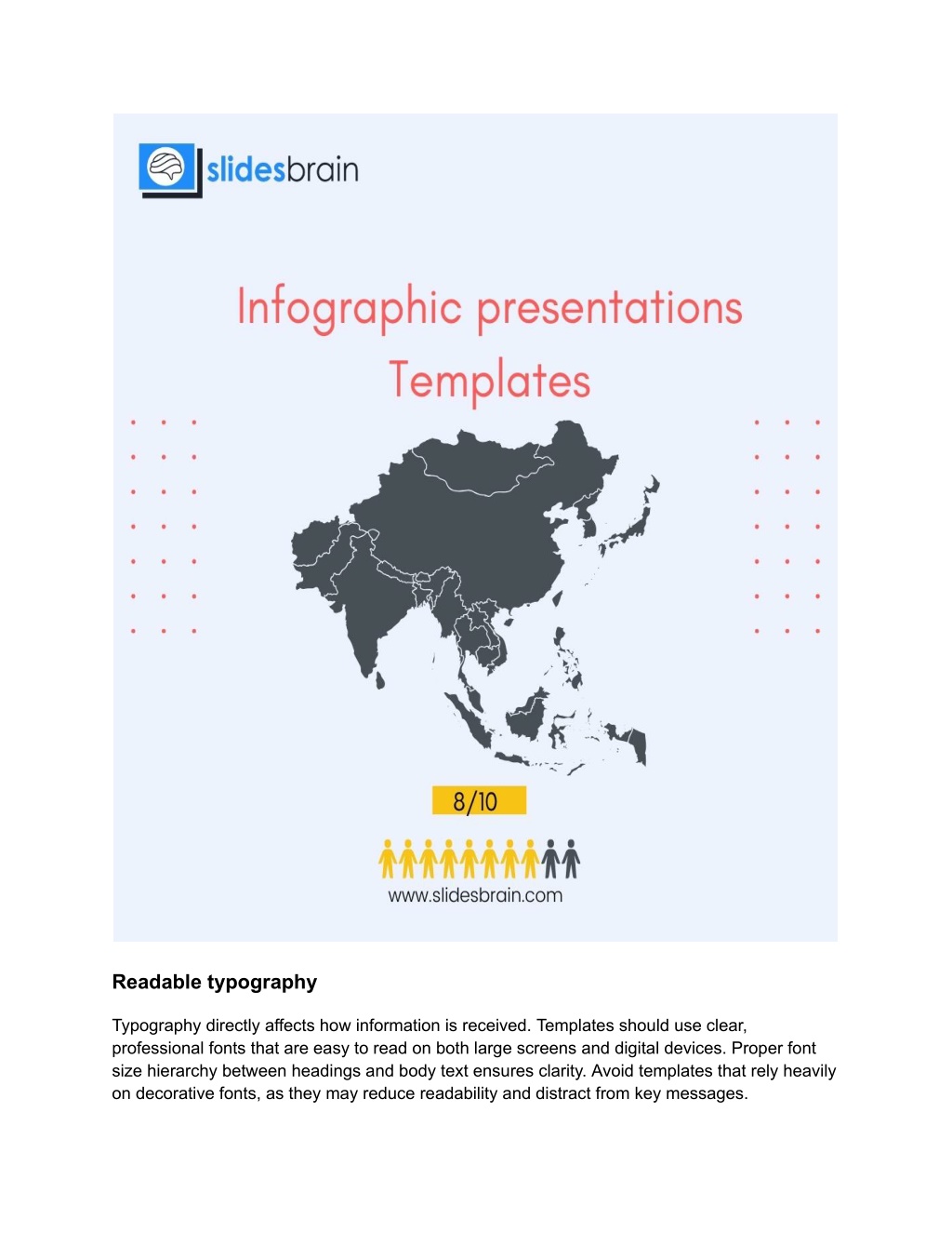 Strong hierarchy ensures that key points stand out and supporting information remains easy to follow. This is especially important when presenting complex ideas or multi-step processes. Consistency across slides Consistency plays a vital role in professional presentations. Templates should maintain uniform fonts, color schemes, icon styles, and spacing across all slides. Consistent design builds trust, improves readability, and helps audiences focus on content rather than adjusting to visual changes. Inconsistent layouts may make presentations appear unstructured or unpolished. Customization flexibility Customization is essential for adapting templates to your specific content and brand needs. Infographic presentations Templates should allow easy editing of text, colors, shapes, and icons. Flexible templates enable you to tailor visuals without breaking the design structure. Editable charts and modular elements are especially useful when presenting different types of data or updating content regularly.