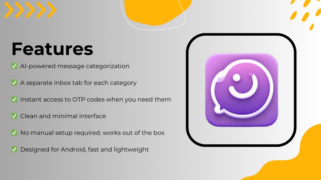 3. Features ✅ AI-powered message categorization ✅ A separate inbox tab for each category ✅ Instant access to OTP codes when you need them ✅ Clean and minimal interface ✅ No manual setup required. works out of the box ✅ Designed for Android, fast and lightweight