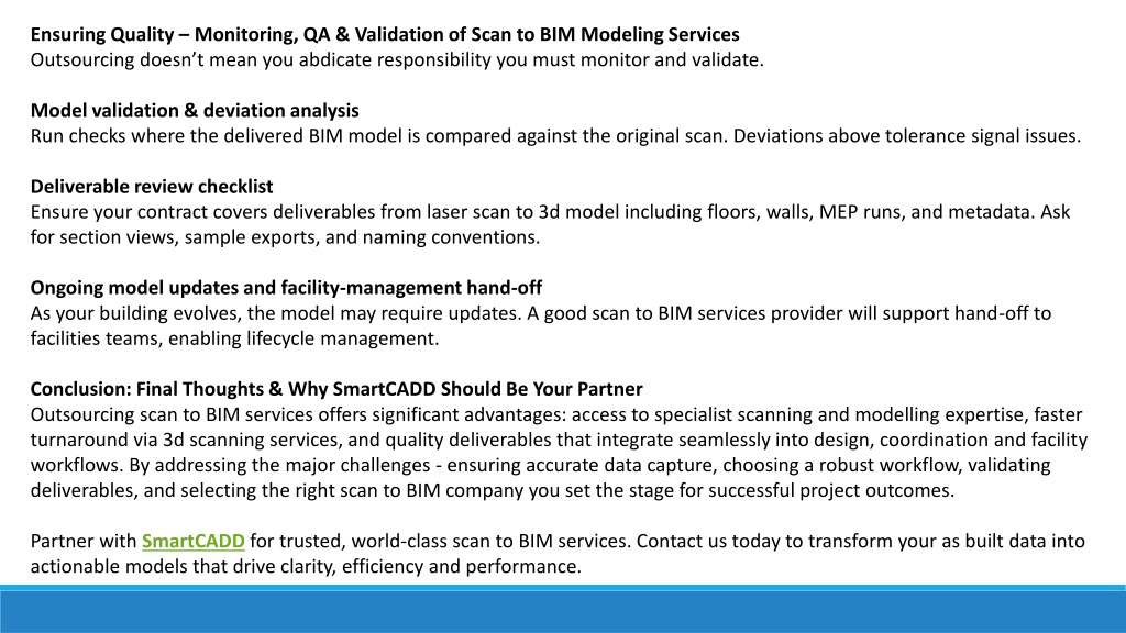 6. Ensuring Quality – Monitoring, QA & Validation of Scan to BIM Modeling Services Outsourcing doesn’t mean you abdicate responsibility you must monitor and validate.  Model validation & deviation analysis Run checks where the delivered BIM model is compared against the original scan. Deviations above tolerance signal issues.  Deliverable review checklist Ensure your contract covers deliverables from laser scan to 3d model including floors, walls, MEP runs, and metadata. Ask for section views, sample exports, and naming conventions.  Ongoing model updates and facility-management hand-off As your building evolves, the model may require updates. A good scan to BIM services provider will support hand-off to facilities teams, enabling lifecycle management.  Conclusion: Final Thoughts & Why SmartCADD Should Be Your Partner Outsourcing scan to BIM services offers significant advantages: access to specialist scanning and modelling expertise, faster turnaround via 3d scanning services, and quality deliverables that integrate seamlessly into design, coordination and facility workflows. By addressing the major challenges - ensuring accurate data capture, choosing a robust workflow, validating deliverables, and selecting the right scan to BIM company you set the stage for successful project outcomes.  Partner with SmartCADD for trusted, world-class scan to BIM services. Contact us today to transform your as built data into actionable models that drive clarity, efficiency and performance.