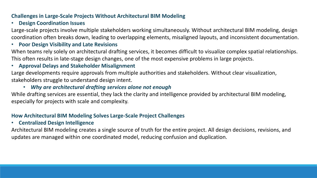 Challenges in Large-Scale Projects Without Architectural BIM Modeling • Design Coordination Issues • Large-scale projects involve multiple stakeholders working simultaneously. Without architectural BIM modeling, design coordination often breaks down, leading to overlapping elements, misaligned layouts, and inconsistent documentation. • Poor Design Visibility and Late Revisions • When teams rely solely on architectural drafting services, it becomes difficult to visualize complex spatial relationships. This often results in late-stage design changes, one of the most expensive problems in large projects. • Approval Delays and Stakeholder Misalignment • Large developments require approvals from multiple authorities and stakeholders. Without clear visualization, stakeholders struggle to understand design intent. • Why are architectural drafting services alone not enough • While drafting services are essential, they lack the clarity and intelligence provided by architectural BIM modeling, especially for projects with scale and complexity. • How Architectural BIM Modeling Solves Large-Scale Project Challenges • Centralized Design Intelligence • Architectural BIM modeling creates a single source of truth for the entire project. All design decisions, revisions, and updates are managed within one coordinated model, reducing confusion and duplication.