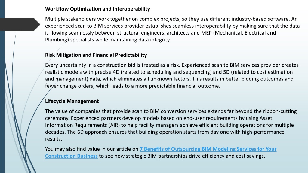Workflow Optimization and Interoperability Multiple stakeholders work together on complex projects, so they use different industry-based software. An experienced scan to BIM services provider establishes seamless interoperability by making sure that the data is flowing seamlessly between structural engineers, architects and MEP (Mechanical, Electrical and Plumbing) specialists while maintaining data integrity. Risk Mitigation and Financial Predictability Every uncertainty in a construction bid is treated as a risk. Experienced scan to BIM services provider creates realistic models with precise 4D (related to scheduling and sequencing) and 5D (related to cost estimation and management) data, which eliminates all unknown factors. This results in better bidding outcomes and fewer change orders, which leads to a more predictable financial outcome. Lifecycle Management The value of companies that provide scan to BIM conversion services extends far beyond the ribbon-cutting ceremony. Experienced partners develop models based on end-user requirements by using Asset Information Requirements (AIR) to help facility managers achieve efficient building operations for multiple decades. The 6D approach ensures that building operation starts from day one with high-performance results. You may also find value in our article on 7 Benefits of Outsourcing BIM Modeling Services for Your Construction Business to see how strategic BIM partnerships drive efficiency and cost savings.