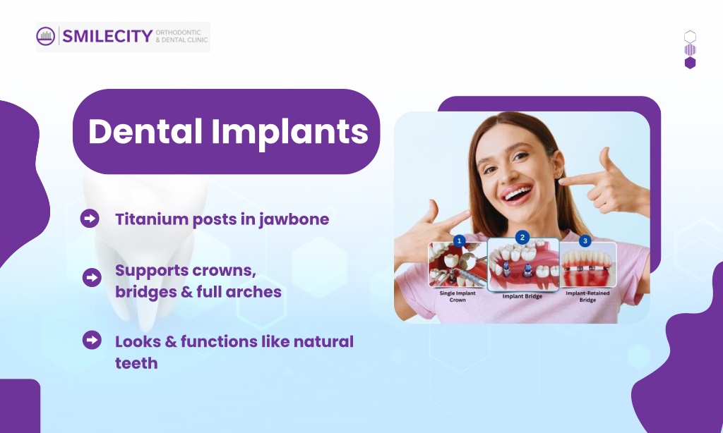 5. Dental Implants Titanium posts in jawbone Supports crowns, bridges & full arches Looks & functions like natural teeth