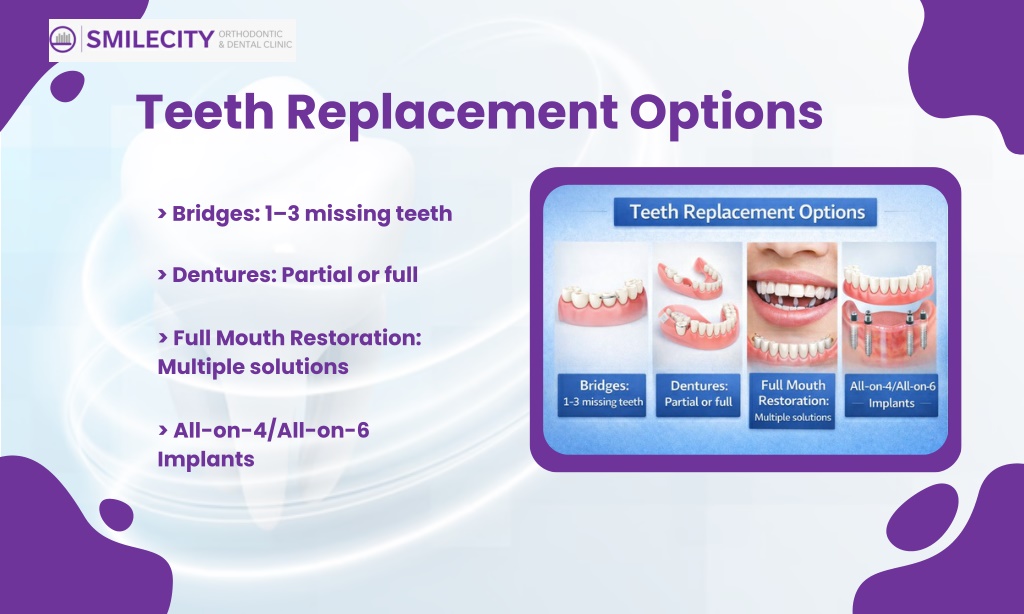 6. Teeth Replacement Options > Bridges: 1–3 missing teeth > Dentures: Partial or full > Full Mouth Restoration: Multiple solutions > All-on-4/All-on-6 Implants