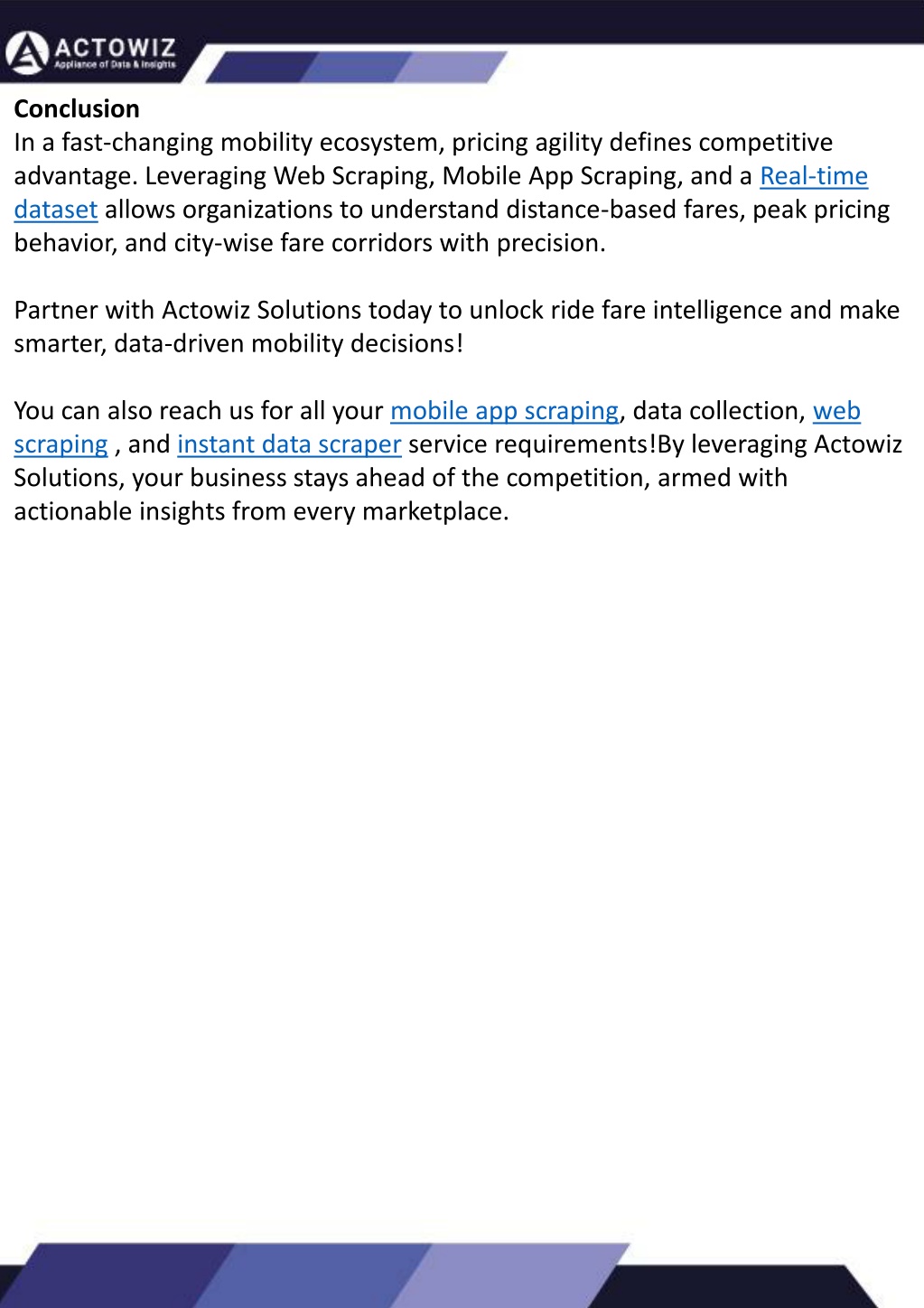 Between 2020 and 2026, peak-hour premiums increased as demand Extracting Information from TripAdvisor: A Guide to outpaced driver availability. However, the extent of surge pricing How to Effectively Use Competitor Price Trackers: Operational Guidance and Benefits Detailed Guide Peak vs Non-Peak Fare Index How to Use Zomato API to Scrape Restaurant Data – A What are Datasets? - A Comprehensive Guide Scraping Data from Hotels and Restaurants varies by city and platform strategy. Year Non-Peak Peak 2020 1.0 1.25 2022 1.0 1.35 2024 1.0 1.45 2026* 1.0 1.55 Peak pricing intelligence supports better driver allocation, surge control, and rider transparency. Mapping Fare Corridors Within Cities Urban geography strongly influences fare behavior. City-wise ride fare intelligence maps high-traffic corridors, business districts, and residential Introduction zones to understand cost variations between routes. From 2020 to 2026, fare corridors became more pronounced as cities expanded and congestion increased. Corridor-based insights help optimize Introduction This blog will provide a comprehensive overview of datasets, including their definition, different types of datasets, and strategies for maximizing the value of data. What is a Dataset? web scraping tool. TripAdvisor stands out as a powerhouse with an extensive database comprising over 8 million locations, 1 billion reviews, and support for 29 languages. As of 2022, when the cumulative reviews surpassed the one billion mark, it became evident that TripAdvisor's meticulous gaze would soon cover every restaurant, hotel, vacation rental, or attraction listing. Unlocking the Potential: The Advantages of Scraping TripAdvisor Data Business District Leveraging the appropriate API makes scraping TripAdvisor on a large scale a straightforward task. You don't need to possess advanced computer skills to achieve this. Our comprehensive, step-by- step guide is designed to walk you through extracting data from TripAdvisor using a user-friendly In the dynamic landscape of eCommerce, pricing strategy stands paramount, especially for digital storefronts. Modern consumers are discerning, often prioritizing price comparison as a pivotal step before purchasing. The allure of securing the best deals and most competitive prices drives this behavior. Consequently, a significant portion of online shoppers actively engage in price monitoring across various platforms. Recognizing this trend, online retailers must adeptly employ competitor price trackers to stay ahead. are increasingly explored and celebrated online, the demand for up-to-date restaurant data is insatiable. As food enthusiasts and businesses seek the latest insights into menus, reviews, and more, the Zomato API emerges as a powerful tool for scraping this invaluable information. Corridor Type Introduction route planning and pricing fairness. In the dynamic world of digital gastronomy, where culinary delights and dining experiences Average Fare by Urban Corridor (2026*) By leveraging retail data scraping techniques, businesses can collect comprehensive retail data, offering insights into the broader market's pricing landscape. Such price intelligence empowers retailers to craft a robust pricing strategy, bolstering sales, enhancing profit margins, and fostering customer loyalty. Moreover, a data-driven eCommerce pricing approach ensures competitiveness, with dynamic pricing becoming increasingly prevalent. Our comprehensive guide delves into the intricate art of utilizing the Zomato API to scrape restaurant data. Whether you're a restaurateur striving to understand your competitors, a food blogger searching for fresh content, or a data enthusiast eager to explore culinary trends, this guide will serve as your compass in the world of data extraction. Amidst TripAdvisor's vast sea of information lies a treasure trove awaiting extraction, analysis, and innovative presentation. For those in the tourism, hospitality, or travel sectors, harnessing TripAdvisor data proves invaluable for monitoring competitors and supporting strategic business decisions. The TripAdvisor Scraper facilitates seamless and rapid web scraping, offering the most straightforward route to consistently obtaining data at scale. This article delves into the myriad benefits of scraping TripAdvisor, shedding light on how this process can be initiated, including exploring the initial steps involving API utilization. Dive into the realm of data-driven insights with TripAdvisor scraping. Avg Fare Airport Routes €22.5 In essence, utilizing a competent competitor price tracker facilitates effective pricing optimization and solidifies a retailer's position in the fiercely competitive eCommerce arena. €14.8 Residential Areas €9.6 We will navigate through the intricacies of Zomato Scraper, uncovering its capabilities to provide you with rich, real-time restaurant data. From scraping restaurant details to accessing customer reviews, our detailed guide ensures that you harness the full potential of this resource. Suburban Routes €18.2