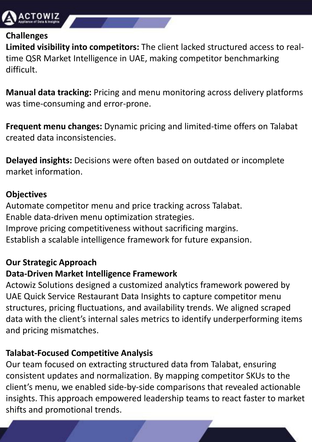 Challenges Extracting Information from TripAdvisor: A Guide to Limited visibility into competitors: The client lacked structured access to real- time QSR Market Intelligence in UAE, making competitor benchmarking How to Effectively Use Competitor Price Trackers: Operational Guidance and Benefits Detailed Guide Manual data tracking: Pricing and menu monitoring across delivery platforms was time-consuming and error-prone. How to Use Zomato API to Scrape Restaurant Data – A What are Datasets? - A Comprehensive Guide Scraping Data from Hotels and Restaurants difficult. Frequent menu changes: Dynamic pricing and limited-time offers on Talabat created data inconsistencies. Delayed insights: Decisions were often based on outdated or incomplete market information. Objectives Automate competitor menu and price tracking across Talabat. Enable data-driven menu optimization strategies. Improve pricing competitiveness without sacrificing margins. Establish a scalable intelligence framework for future expansion. Introduction Our Strategic Approach Data-Driven Market Intelligence Framework Introduction This blog will provide a comprehensive overview of datasets, including their definition, different types of datasets, and strategies for maximizing the value of data. What is a Dataset? web scraping tool. TripAdvisor stands out as a powerhouse with an extensive database comprising over 8 million locations, 1 billion reviews, and support for 29 languages. As of 2022, when the cumulative reviews surpassed the one billion mark, it became evident that TripAdvisor's meticulous gaze would soon cover every restaurant, hotel, vacation rental, or attraction listing. Unlocking the Potential: The Advantages of Scraping TripAdvisor Data Talabat-Focused Competitive Analysis Our team focused on extracting structured data from Talabat, ensuring consistent updates and normalization. By mapping competitor SKUs to the client’s menu, we enabled side-by-side comparisons that revealed actionable insights. This approach empowered leadership teams to react faster to market shifts and promotional trends. Leveraging the appropriate API makes scraping TripAdvisor on a large scale a straightforward task. You don't need to possess advanced computer skills to achieve this. Our comprehensive, step-by- step guide is designed to walk you through extracting data from TripAdvisor using a user-friendly In the dynamic landscape of eCommerce, pricing strategy stands paramount, especially for digital storefronts. Modern consumers are discerning, often prioritizing price comparison as a pivotal step before purchasing. The allure of securing the best deals and most competitive prices drives this behavior. Consequently, a significant portion of online shoppers actively engage in price monitoring across various platforms. Recognizing this trend, online retailers must adeptly employ competitor price trackers to stay ahead. are increasingly explored and celebrated online, the demand for up-to-date restaurant data is insatiable. As food enthusiasts and businesses seek the latest insights into menus, reviews, and more, the Zomato API emerges as a powerful tool for scraping this invaluable information. and pricing mismatches. Introduction Actowiz Solutions designed a customized analytics framework powered by In the dynamic world of digital gastronomy, where culinary delights and dining experiences UAE Quick Service Restaurant Data Insights to capture competitor menu structures, pricing fluctuations, and availability trends. We aligned scraped data with the client’s internal sales metrics to identify underperforming items By leveraging retail data scraping techniques, businesses can collect comprehensive retail data, offering insights into the broader market's pricing landscape. Such price intelligence empowers retailers to craft a robust pricing strategy, bolstering sales, enhancing profit margins, and fostering customer loyalty. Moreover, a data-driven eCommerce pricing approach ensures competitiveness, with dynamic pricing becoming increasingly prevalent. Our comprehensive guide delves into the intricate art of utilizing the Zomato API to scrape restaurant data. Whether you're a restaurateur striving to understand your competitors, a food blogger searching for fresh content, or a data enthusiast eager to explore culinary trends, this guide will serve as your compass in the world of data extraction. Amidst TripAdvisor's vast sea of information lies a treasure trove awaiting extraction, analysis, and innovative presentation. For those in the tourism, hospitality, or travel sectors, harnessing TripAdvisor data proves invaluable for monitoring competitors and supporting strategic business decisions. The TripAdvisor Scraper facilitates seamless and rapid web scraping, offering the most straightforward route to consistently obtaining data at scale. This article delves into the myriad benefits of scraping TripAdvisor, shedding light on how this process can be initiated, including exploring the initial steps involving API utilization. Dive into the realm of data-driven insights with TripAdvisor scraping. In essence, utilizing a competent competitor price tracker facilitates effective pricing optimization and solidifies a retailer's position in the fiercely competitive eCommerce arena. We will navigate through the intricacies of Zomato Scraper, uncovering its capabilities to provide you with rich, real-time restaurant data. From scraping restaurant details to accessing customer reviews, our detailed guide ensures that you harness the full potential of this resource.
