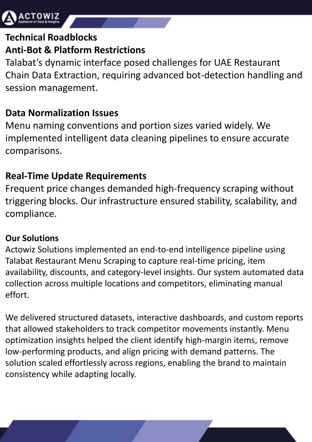 Technical Roadblocks Extracting Information from TripAdvisor: A Guide to Anti-Bot & Platform Restrictions How to Effectively Use Competitor Price Trackers: Operational Guidance and Benefits Detailed Guide Chain Data Extraction, requiring advanced bot-detection handling and session management. How to Use Zomato API to Scrape Restaurant Data – A What are Datasets? - A Comprehensive Guide Scraping Data from Hotels and Restaurants Talabat’s dynamic interface posed challenges for UAE Restaurant Data Normalization Issues Menu naming conventions and portion sizes varied widely. We implemented intelligent data cleaning pipelines to ensure accurate comparisons. Real-Time Update Requirements Frequent price changes demanded high-frequency scraping without triggering blocks. Our infrastructure ensured stability, scalability, and compliance. Our Solutions Actowiz Solutions implemented an end-to-end intelligence pipeline using Introduction Talabat Restaurant Menu Scraping to capture real-time pricing, item availability, discounts, and category-level insights. Our system automated data Introduction This blog will provide a comprehensive overview of datasets, including their definition, different types of datasets, and strategies for maximizing the value of data. What is a Dataset? web scraping tool. TripAdvisor stands out as a powerhouse with an extensive database comprising over 8 million locations, 1 billion reviews, and support for 29 languages. As of 2022, when the cumulative reviews surpassed the one billion mark, it became evident that TripAdvisor's meticulous gaze would soon cover every restaurant, hotel, vacation rental, or attraction listing. Unlocking the Potential: The Advantages of Scraping TripAdvisor Data solution scaled effortlessly across regions, enabling the brand to maintain consistency while adapting locally. Leveraging the appropriate API makes scraping TripAdvisor on a large scale a straightforward task. You don't need to possess advanced computer skills to achieve this. Our comprehensive, step-by- step guide is designed to walk you through extracting data from TripAdvisor using a user-friendly In the dynamic landscape of eCommerce, pricing strategy stands paramount, especially for digital storefronts. Modern consumers are discerning, often prioritizing price comparison as a pivotal step before purchasing. The allure of securing the best deals and most competitive prices drives this behavior. Consequently, a significant portion of online shoppers actively engage in price monitoring across various platforms. Recognizing this trend, online retailers must adeptly employ competitor price trackers to stay ahead. are increasingly explored and celebrated online, the demand for up-to-date restaurant data is insatiable. As food enthusiasts and businesses seek the latest insights into menus, reviews, and more, the Zomato API emerges as a powerful tool for scraping this invaluable information. that allowed stakeholders to track competitor movements instantly. Menu optimization insights helped the client identify high-margin items, remove low-performing products, and align pricing with demand patterns. The Introduction collection across multiple locations and competitors, eliminating manual In the dynamic world of digital gastronomy, where culinary delights and dining experiences effort. We delivered structured datasets, interactive dashboards, and custom reports By leveraging retail data scraping techniques, businesses can collect comprehensive retail data, offering insights into the broader market's pricing landscape. Such price intelligence empowers retailers to craft a robust pricing strategy, bolstering sales, enhancing profit margins, and fostering customer loyalty. Moreover, a data-driven eCommerce pricing approach ensures competitiveness, with dynamic pricing becoming increasingly prevalent. Our comprehensive guide delves into the intricate art of utilizing the Zomato API to scrape restaurant data. Whether you're a restaurateur striving to understand your competitors, a food blogger searching for fresh content, or a data enthusiast eager to explore culinary trends, this guide will serve as your compass in the world of data extraction. Amidst TripAdvisor's vast sea of information lies a treasure trove awaiting extraction, analysis, and innovative presentation. For those in the tourism, hospitality, or travel sectors, harnessing TripAdvisor data proves invaluable for monitoring competitors and supporting strategic business decisions. The TripAdvisor Scraper facilitates seamless and rapid web scraping, offering the most straightforward route to consistently obtaining data at scale. This article delves into the myriad benefits of scraping TripAdvisor, shedding light on how this process can be initiated, including exploring the initial steps involving API utilization. Dive into the realm of data-driven insights with TripAdvisor scraping. In essence, utilizing a competent competitor price tracker facilitates effective pricing optimization and solidifies a retailer's position in the fiercely competitive eCommerce arena. We will navigate through the intricacies of Zomato Scraper, uncovering its capabilities to provide you with rich, real-time restaurant data. From scraping restaurant details to accessing customer reviews, our detailed guide ensures that you harness the full potential of this resource.