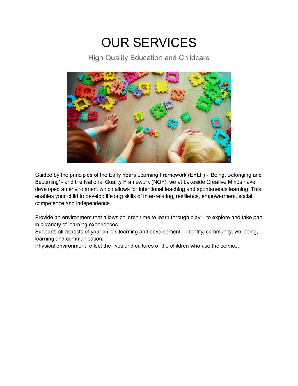 OUR SERVICES High Quality Education and Childcare Guided by the principles of the Early Years Learning Framework (EYLF) - ‘Being, Belonging and Becoming’ - and the National Quality Framework (NQF), we at Lakeside Creative Minds have developed an environment which allows for intentional teaching and spontaneous learning. This enables your child to develop lifelong skills of inter-relating, resilience, empowerment, social competence and independence. Provide an environment that allows children time to learn through play – to explore and take part in a variety of learning experiences. Supports all aspects of your child’s learning and development – identity, community, wellbeing, learning and communication. Physical environment reflect the lives and cultures of the children who use the service.