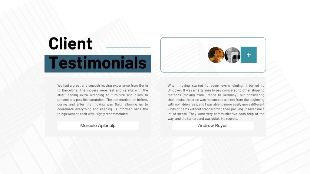 Client Testimonials We had a great and smooth moving experience from Berlin to Barcelona. The movers were fast and careful with the stuff, adding extra wrapping to furniture and bikes to prevent any possible scratches. The communication before, during and after the moving was fluid, allowing us to coordinate everything and keeping us informed once the things were on their way. Highly recommended! • When moving started to seem overwhelming, I turned to Smoover. It was a hefty sum to pay compared to other shipping methods (moving from France to Germany), but considering their costs, the price was reasonable and set from the beginning with no hidden fees, and I was able to more easily move different kinds of items without standardizing their packing. It saved me a lot of stress. They were very communicative each step of the way, and the turnaround was quick. No regrets. Marcelo Aplanalp Andrew Reyes