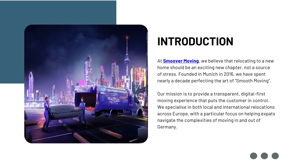 INTRODUCTION • At Smoover Moving, we believe that relocating to a new home should be an exciting new chapter, not a source of stress. Founded in Munich in 2016, we have spent nearly a decade perfecting the art of "Smooth Moving". • Our mission is to provide a transparent, digital-first moving experience that puts the customer in control. We specialise in both local and international relocations across Europe, with a particular focus on helping expats navigate the complexities of moving in and out of Germany.