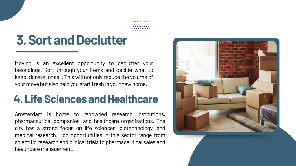 3. Sort and Declutter Moving is an excellent opportunity to declutter your belongings. Sort through your items and decide what to keep, donate, or sell. This will not only reduce the volume of your move but also help you start fresh in your new home. 4. Life Sciences and Healthcare Amsterdam is home to renowned research institutions, pharmaceutical companies, and healthcare organizations. The city has a strong focus on life sciences, biotechnology, and medical research. Job opportunities in this sector range from scientific research and clinical trials to pharmaceutical sales and healthcare management.