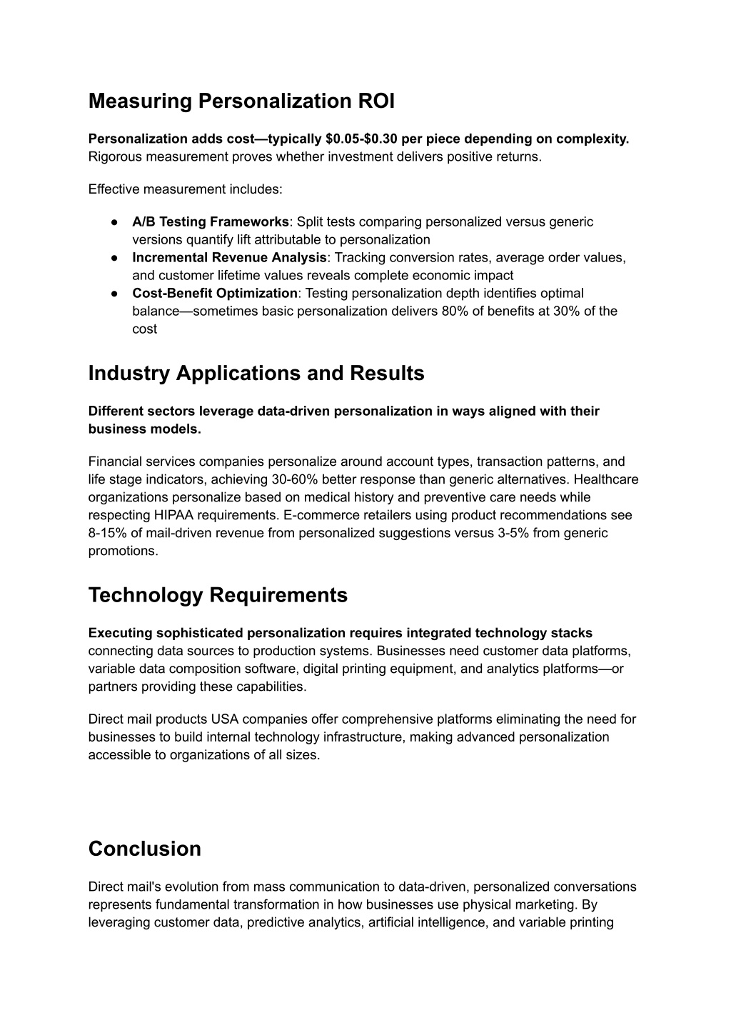 5. Measuring Personalization ROI Personalization adds cost—typically $0.05-$0.30 per piece depending on complexity. Rigorous measurement proves whether investment delivers positive returns. Effective measurement includes: ● A/B Testing Frameworks: Split tests comparing personalized versus generic versions quantify lift attributable to personalization ● Incremental Revenue Analysis: Tracking conversion rates, average order values, and customer lifetime values reveals complete economic impact ● Cost-Benefit Optimization: Testing personalization depth identifies optimal balance—sometimes basic personalization delivers 80% of benefits at 30% of the cost Industry Applications and Results Different sectors leverage data-driven personalization in ways aligned with their business models. Financial services companies personalize around account types, transaction patterns, and life stage indicators, achieving 30-60% better response than generic alternatives. Healthcare organizations personalize based on medical history and preventive care needs while respecting HIPAA requirements. E-commerce retailers using product recommendations see 8-15% of mail-driven revenue from personalized suggestions versus 3-5% from generic promotions. Technology Requirements Executing sophisticated personalization requires integrated technology stacks connecting data sources to production systems. Businesses need customer data platforms, variable data composition software, digital printing equipment, and analytics platforms—or partners providing these capabilities. Direct mail products USA companies offer comprehensive platforms eliminating the need for businesses to build internal technology infrastructure, making advanced personalization accessible to organizations of all sizes. Conclusion Direct mail's evolution from mass communication to data-driven, personalized conversations represents fundamental transformation in how businesses use physical marketing. By leveraging customer data, predictive analytics, artificial intelligence, and variable printing