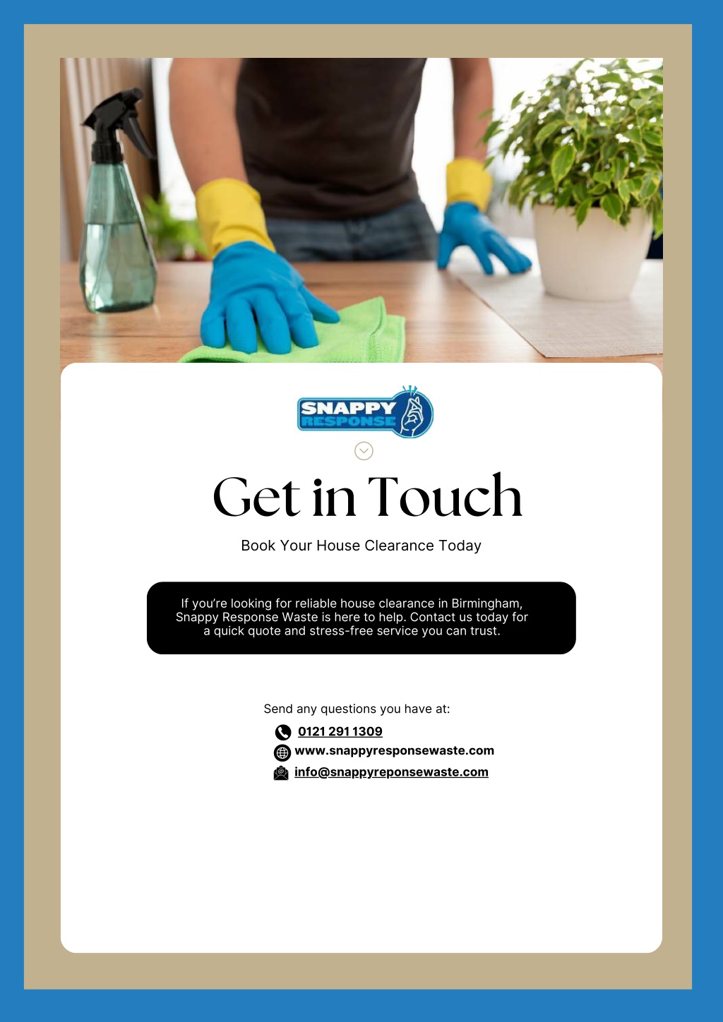 Get in Touch Book Your House Clearance Today If you’re looking for reliable house clearance in Birmingham, Snappy Response Waste is here to help. Contact us today for a quick quote and stress-free service you can trust. Send any questions you have at: 0121 291 1309 www.snappyresponsewaste.com info@snappyreponsewaste.com