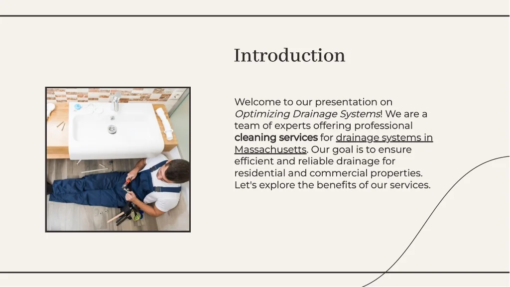 Introduction Introduction Welcome to our presentation on Optimizing Drainage Systems! We are a team of experts offering professional cleaning services for drainage systems in Massachusetts. Our goal is to ensure efficient and reliable drainage for residential and commercial properties. Welcome to our presentation on Optimizing Drainage Systems! We are a team of experts offering professional cleaning services for drainage systems in Massachusetts. Our goal is to ensure efficient and reliable drainage for residential and commercial properties. Let's explore the benefits of our services. Let's explore the benefits of our services.