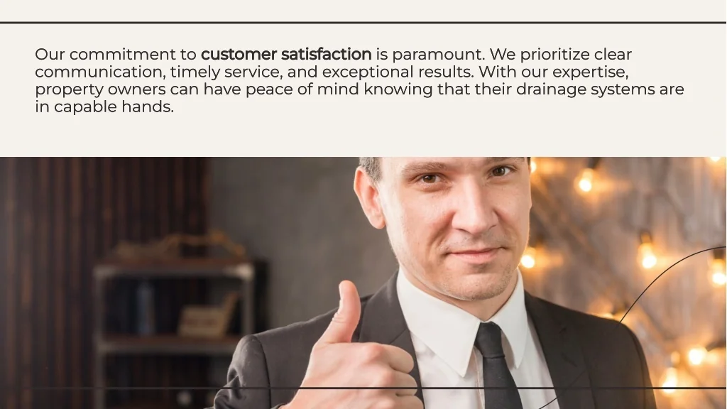 Our commitment to customer satisfaction is paramount. We prioritize clear communication, timely service, and exceptional results. With our expertise, property owners can have peace of mind knowing that their drainage systems are in capable hands. in capable hands. Our commitment to customer satisfaction is paramount. We prioritize clear communication, timely service, and exceptional results. With our expertise, property owners can have peace of mind knowing that their drainage systems are