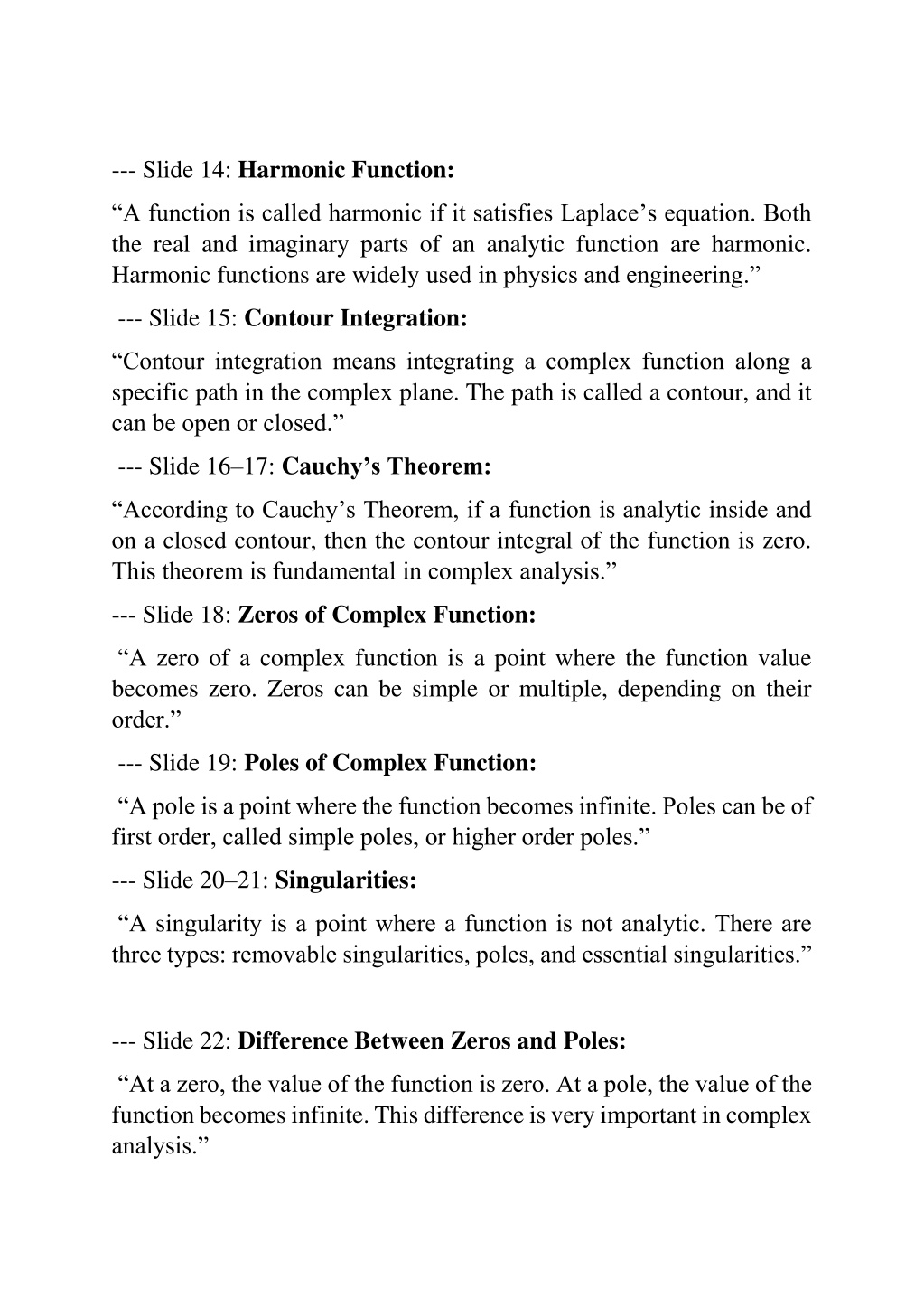 --- Slide 14: Harmonic Function: “A function is called harmonic if it satisfies Laplace’s equation. Both the real and imaginary parts of an analytic function are harmonic. Harmonic functions are widely used in physics and engineering.” --- Slide 15: Contour Integration: “Contour integration means integrating a complex function along a specific path in the complex plane. The path is called a contour, and it can be open or closed.” --- Slide 16–17: Cauchy’s Theorem: “According to Cauchy’s Theorem, if a function is analytic inside and on a closed contour, then the contour integral of the function is zero. This theorem is fundamental in complex analysis.” --- Slide 18: Zeros of Complex Function: “A zero of a complex function is a point where the function value becomes zero. Zeros can be simple or multiple, depending on their order.” --- Slide 19: Poles of Complex Function: “A pole is a point where the function becomes infinite. Poles can be of first order, called simple poles, or higher order poles.” --- Slide 20–21: Singularities: “A singularity is a point where a function is not analytic. There are three types: removable singularities, poles, and essential singularities.” --- Slide 22: Difference Between Zeros and Poles: “At a zero, the value of the function is zero. At a pole, the value of the function becomes infinite. This difference is very important in complex analysis.”