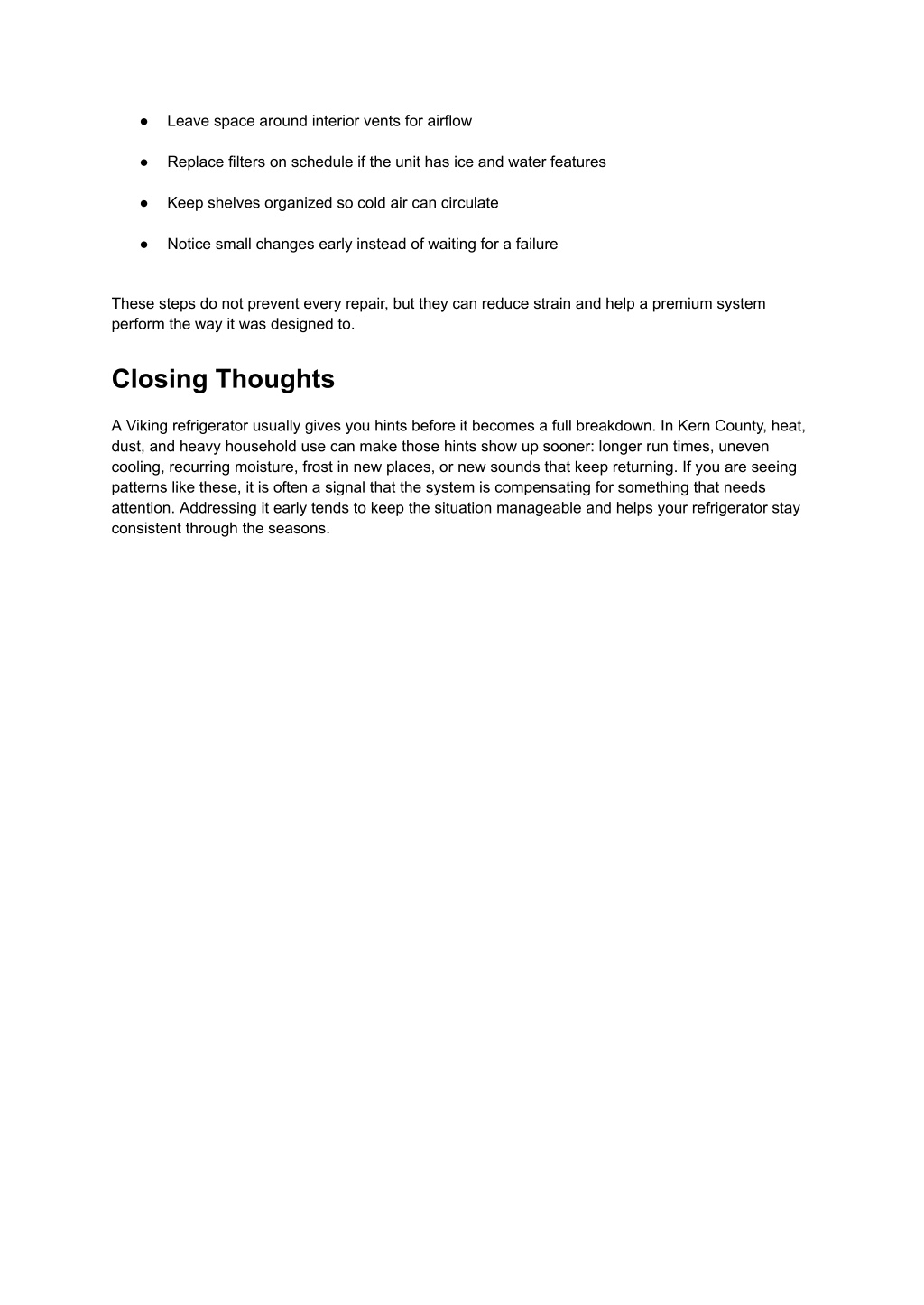 ● Leave space around interior vents for airflow Replace filters on schedule if the unit has ice and water features Keep shelves organized so cold air can circulate Notice small changes early instead of waiting for a failure ● ● ● These steps do not prevent every repair, but they can reduce strain and help a premium system perform the way it was designed to. Closing Thoughts A Viking refrigerator usually gives you hints before it becomes a full breakdown. In Kern County, heat, dust, and heavy household use can make those hints show up sooner: longer run times, uneven cooling, recurring moisture, frost in new places, or new sounds that keep returning. If you are seeing patterns like these, it is often a signal that the system is compensating for something that needs attention. Addressing it early tends to keep the situation manageable and helps your refrigerator stay consistent through the seasons.